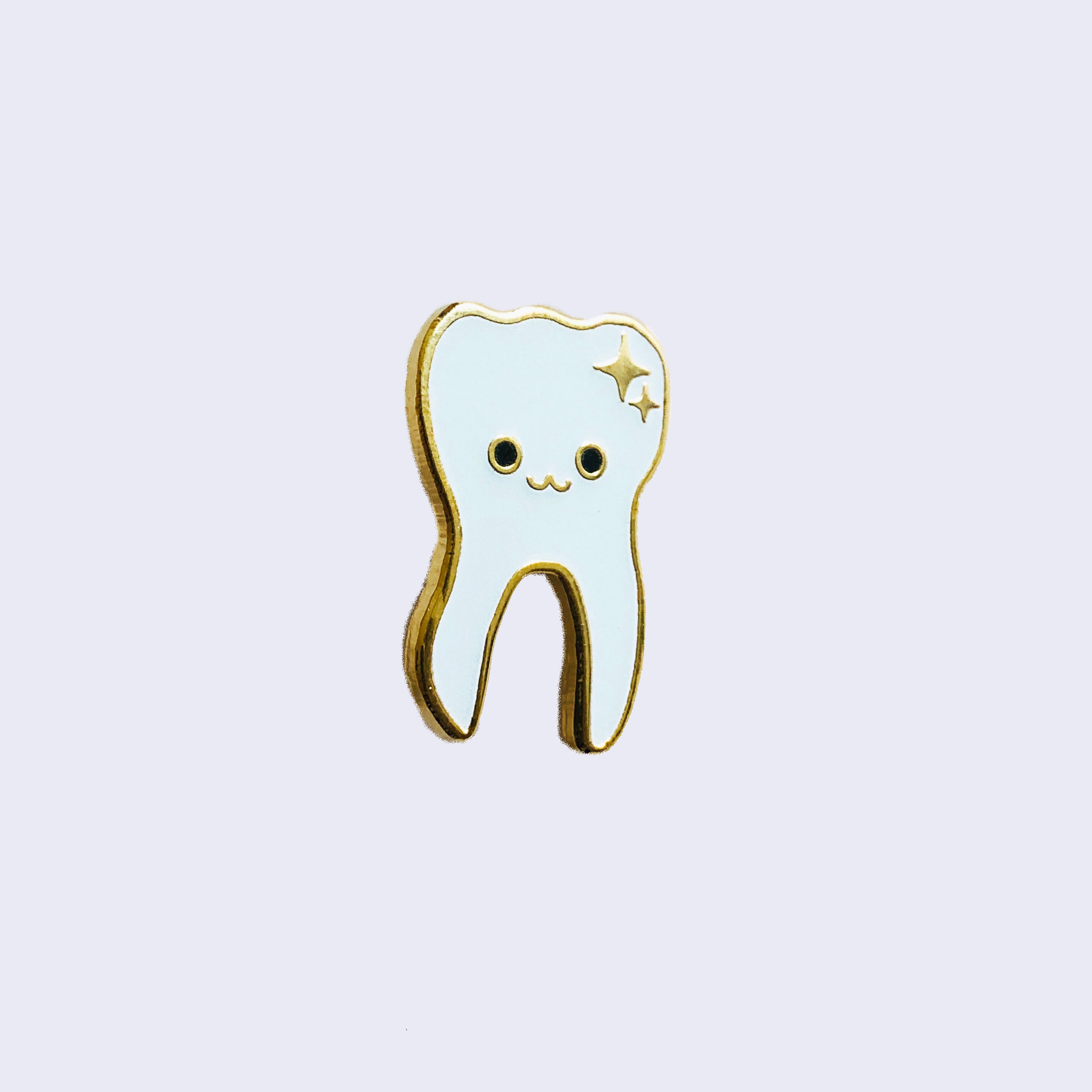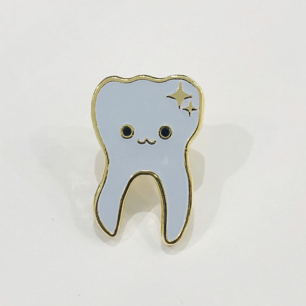 The Glow in the Dark tooth is a pretty example of simple enamel pin making. It has golden sparkles that shows how clean white the tooth is. Wear this one on your lapel. It's cute and one can say that this is an example of a nice enamel, enamel pin. 7/8" Tall