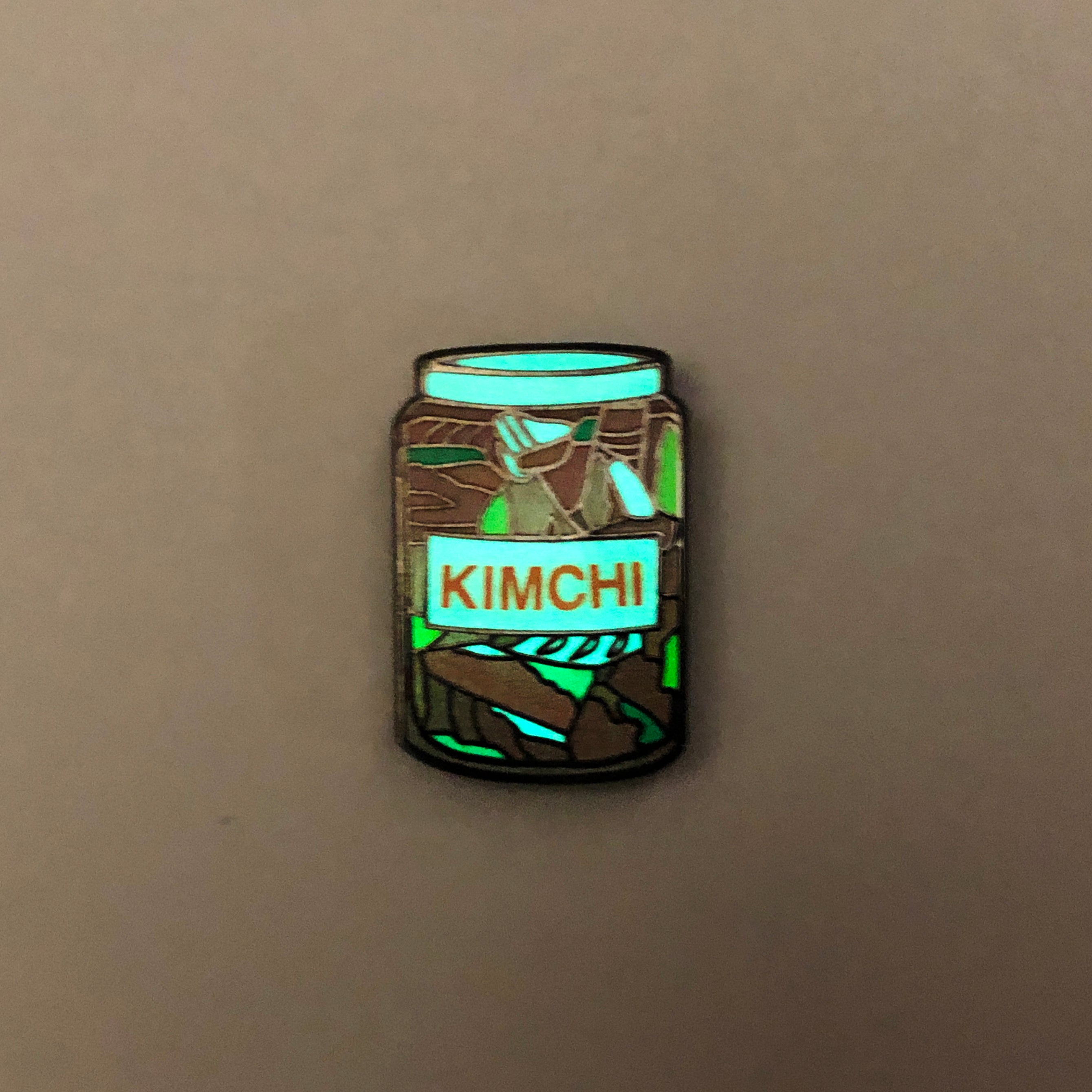 Gif of kimchi enamel pin, one image is of the pin in light and the other is of the pin glowing in the dark.