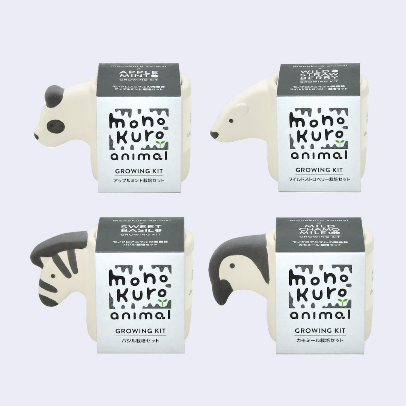 Grow some essential herbs and seasonings in these mini, black and white styled animal shaped pots. (Monokuro means monochrome in Japanese!) Kit comes with the mini planter, growing pellet, seeds and instructions to start out your plant! Choose from Apple Mint (panda), Mild Chamomile (penguin), Wild Strawberry (polar bear) or Sweet Basil (Zebra).