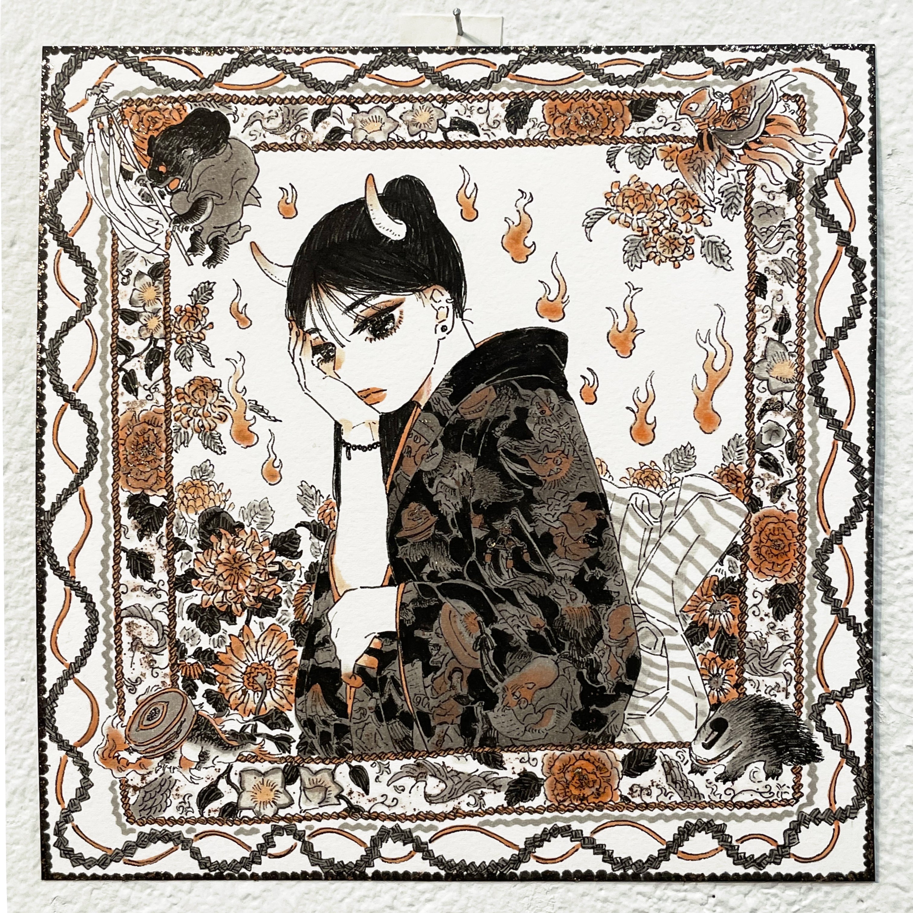 Copic and ink on watercolor paper with gold ink. Piece is unframed.