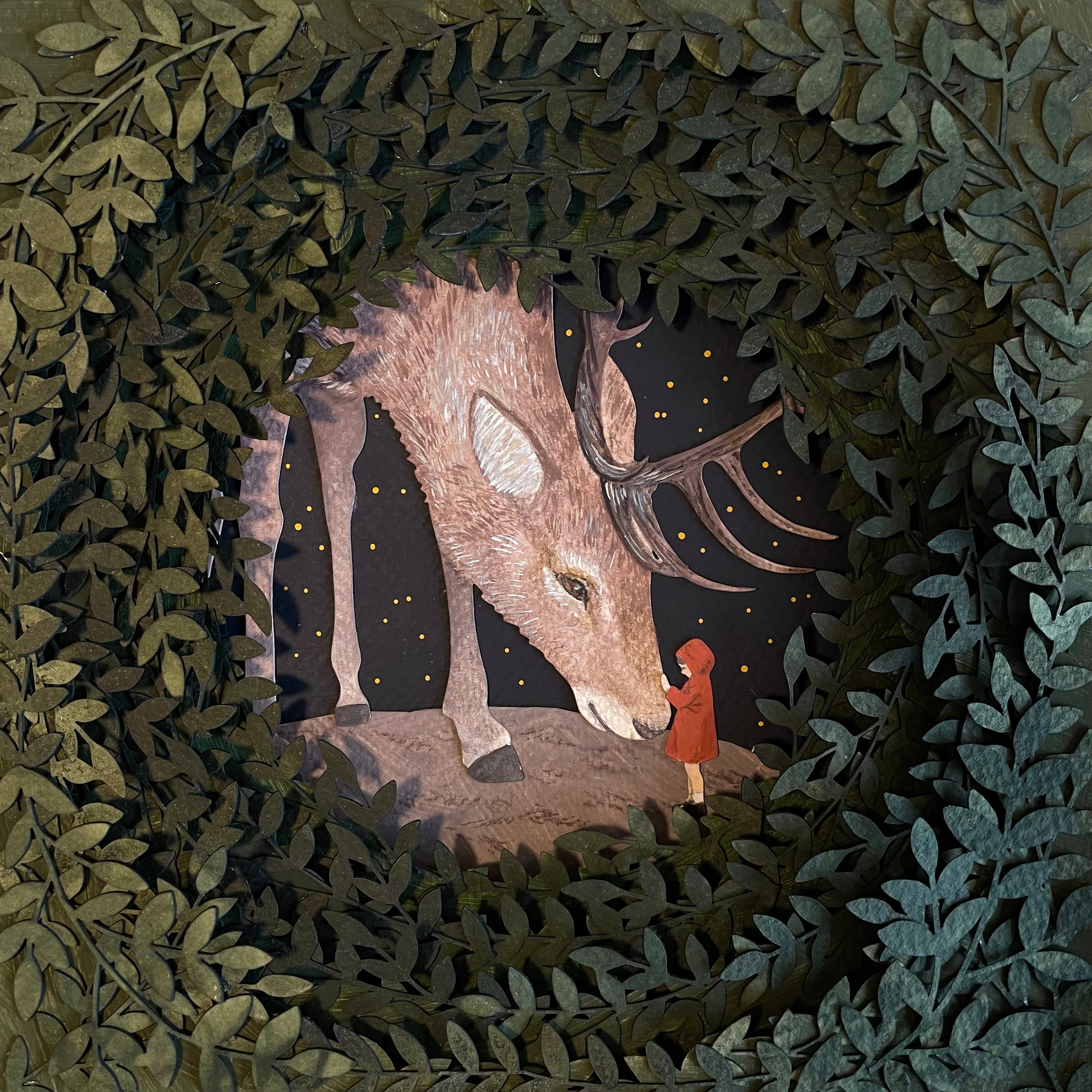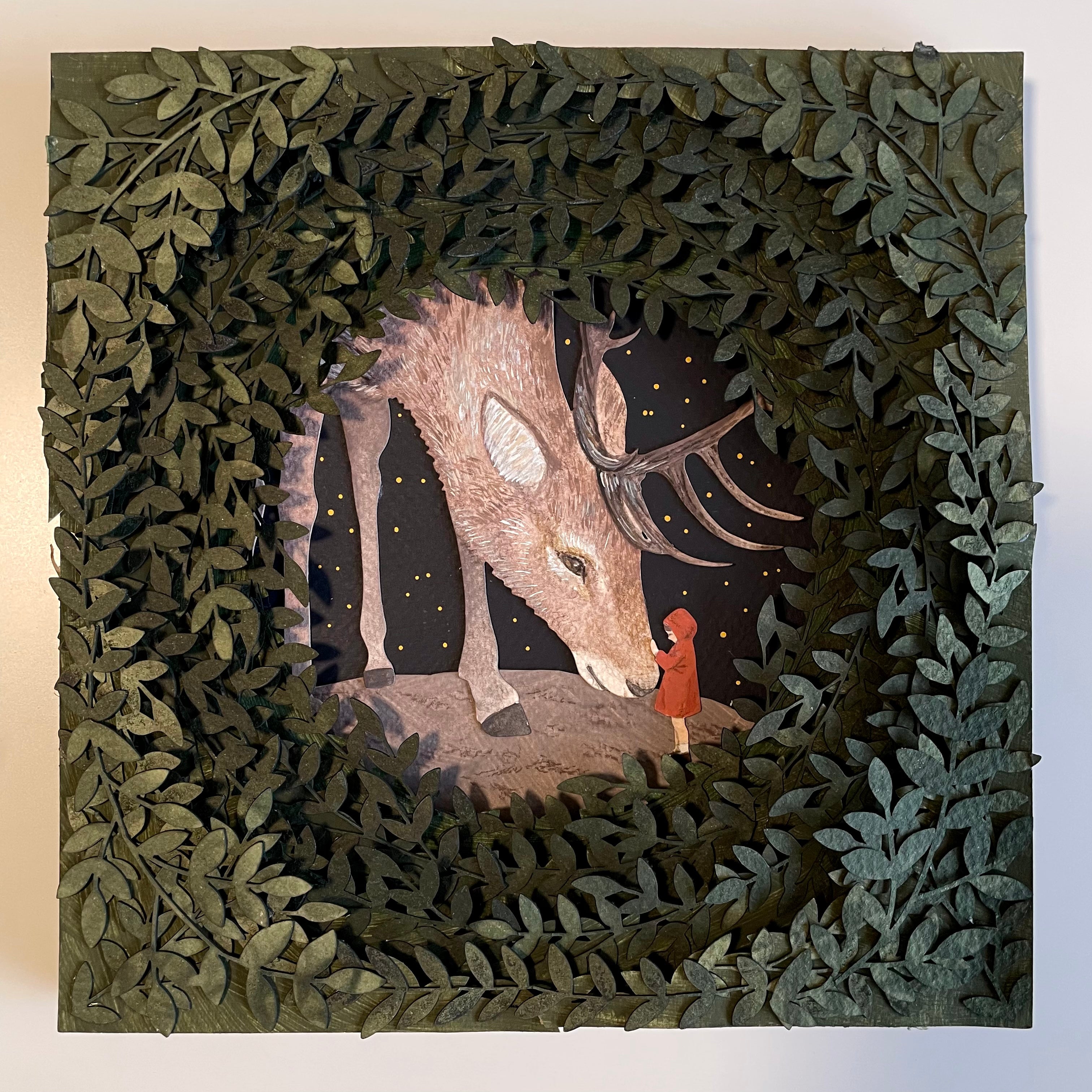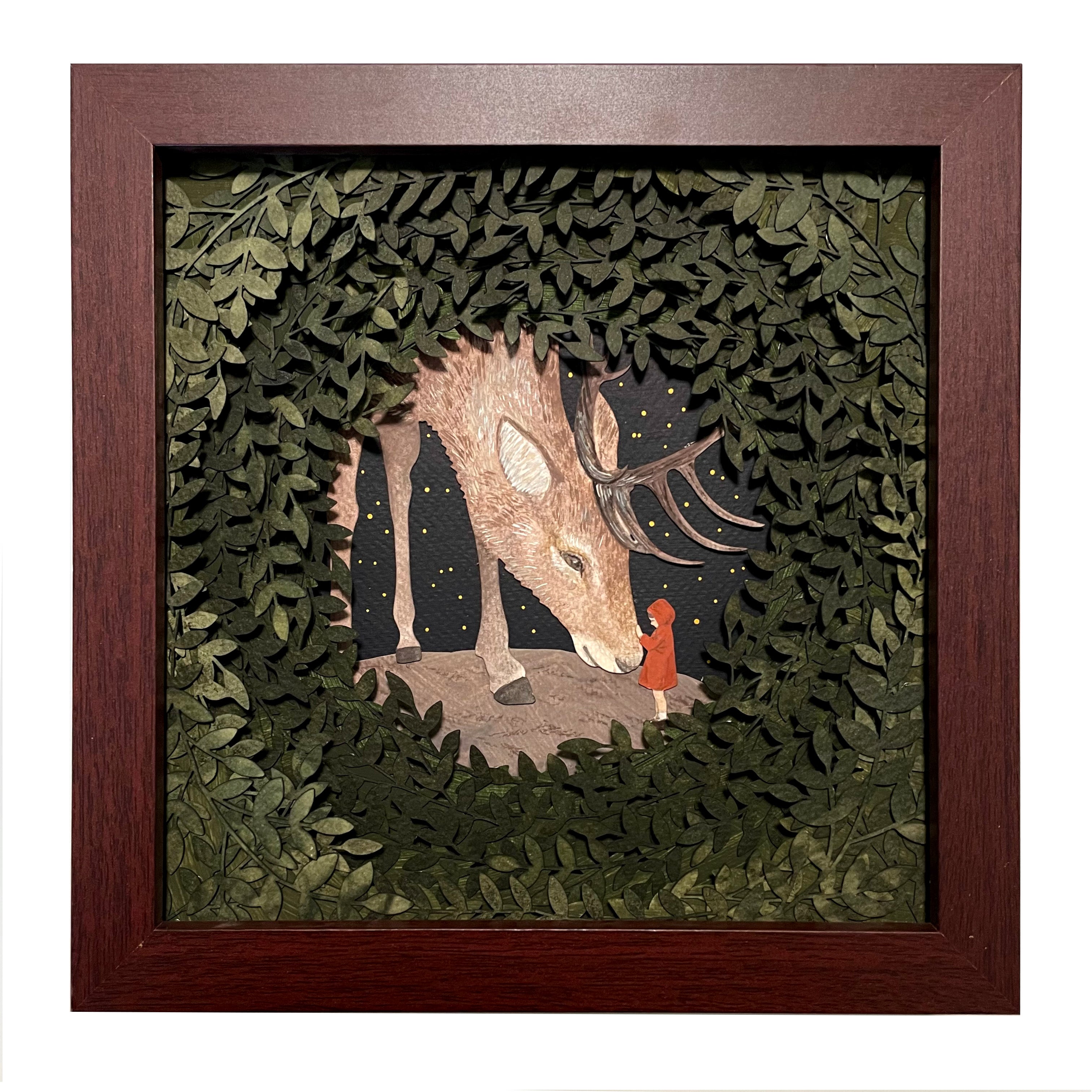 Cut paper, dye, watercolor, acrylic. Piece is framed.