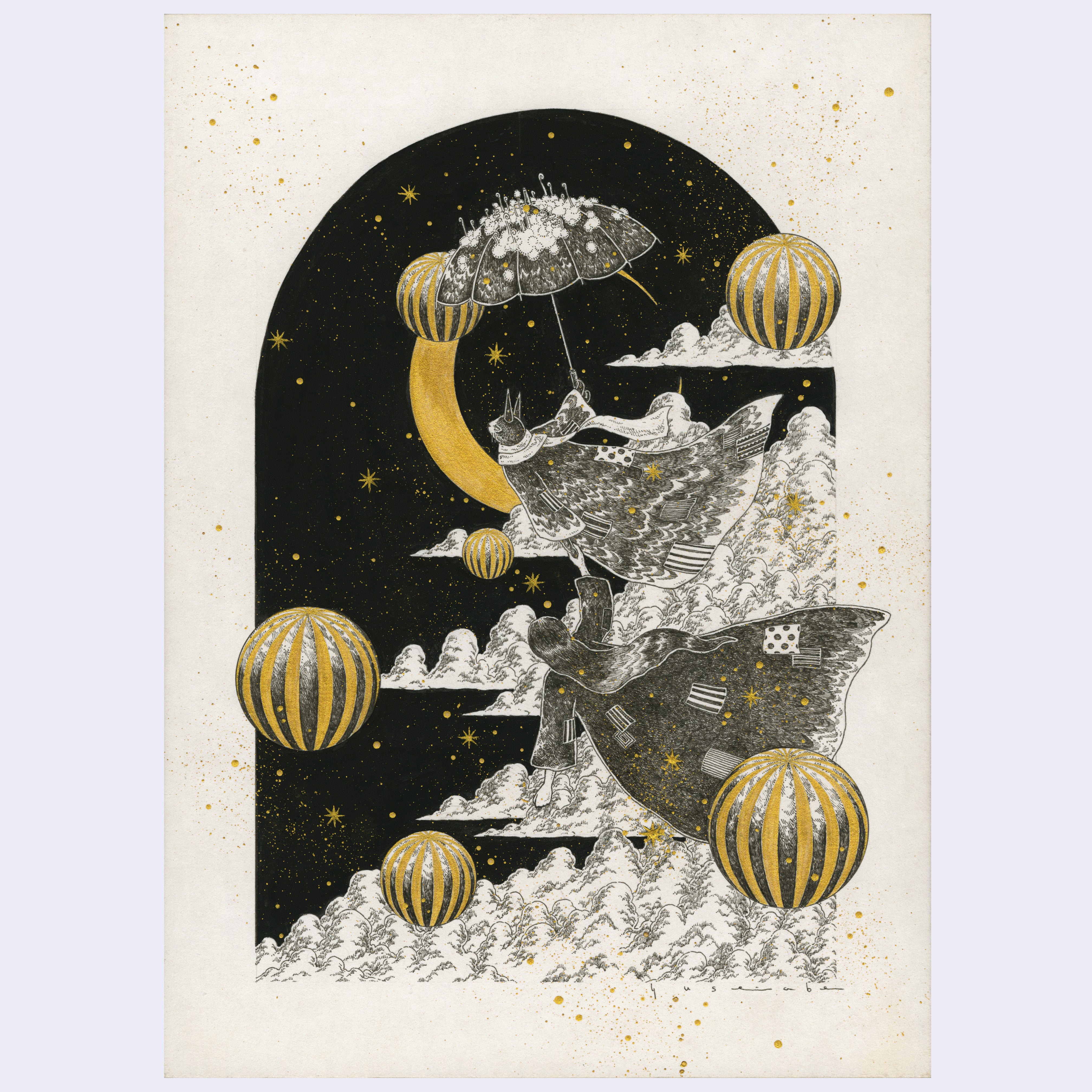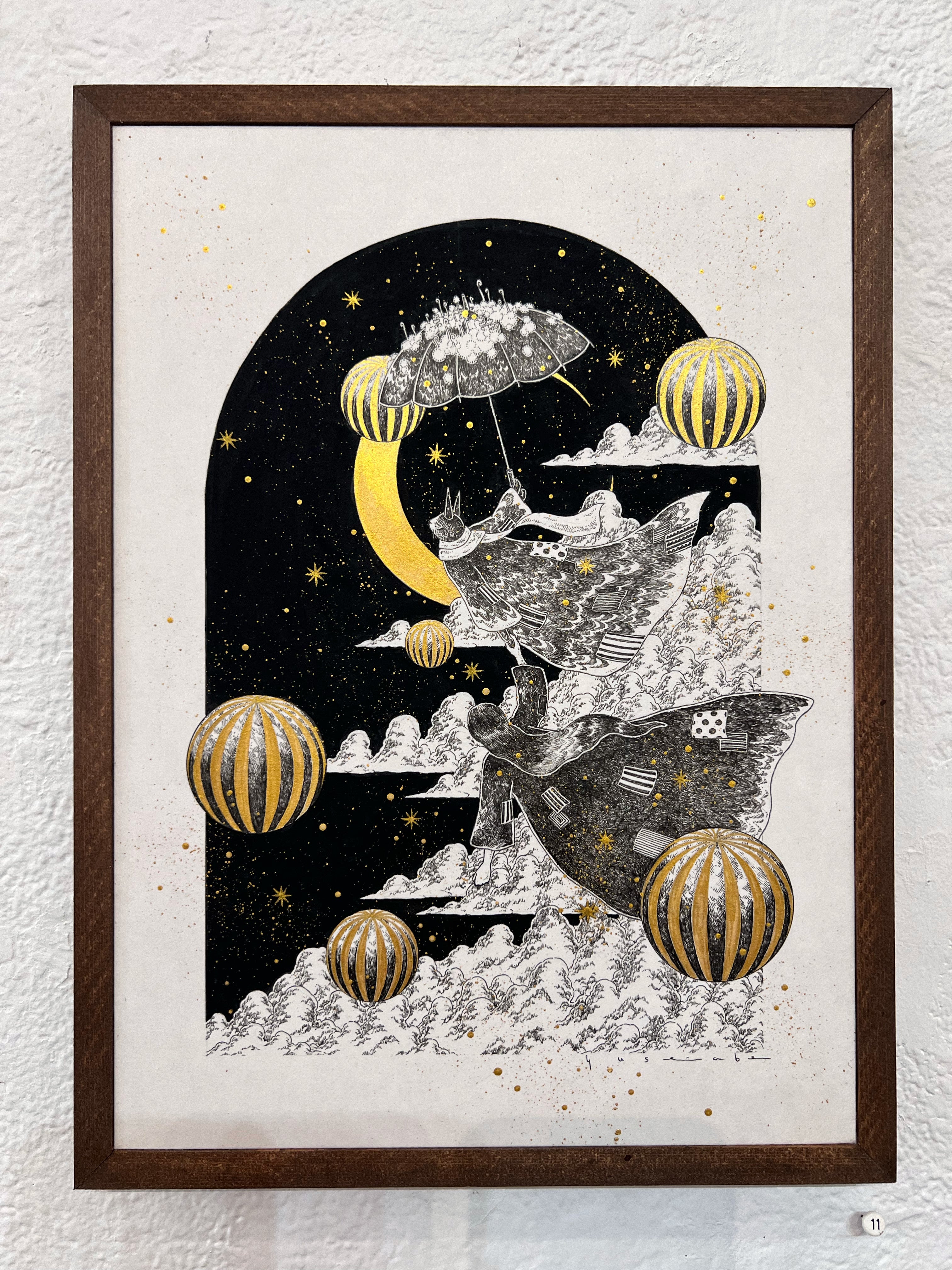 Pen, gouache & gold ink on washi paper. Piece is framed.
