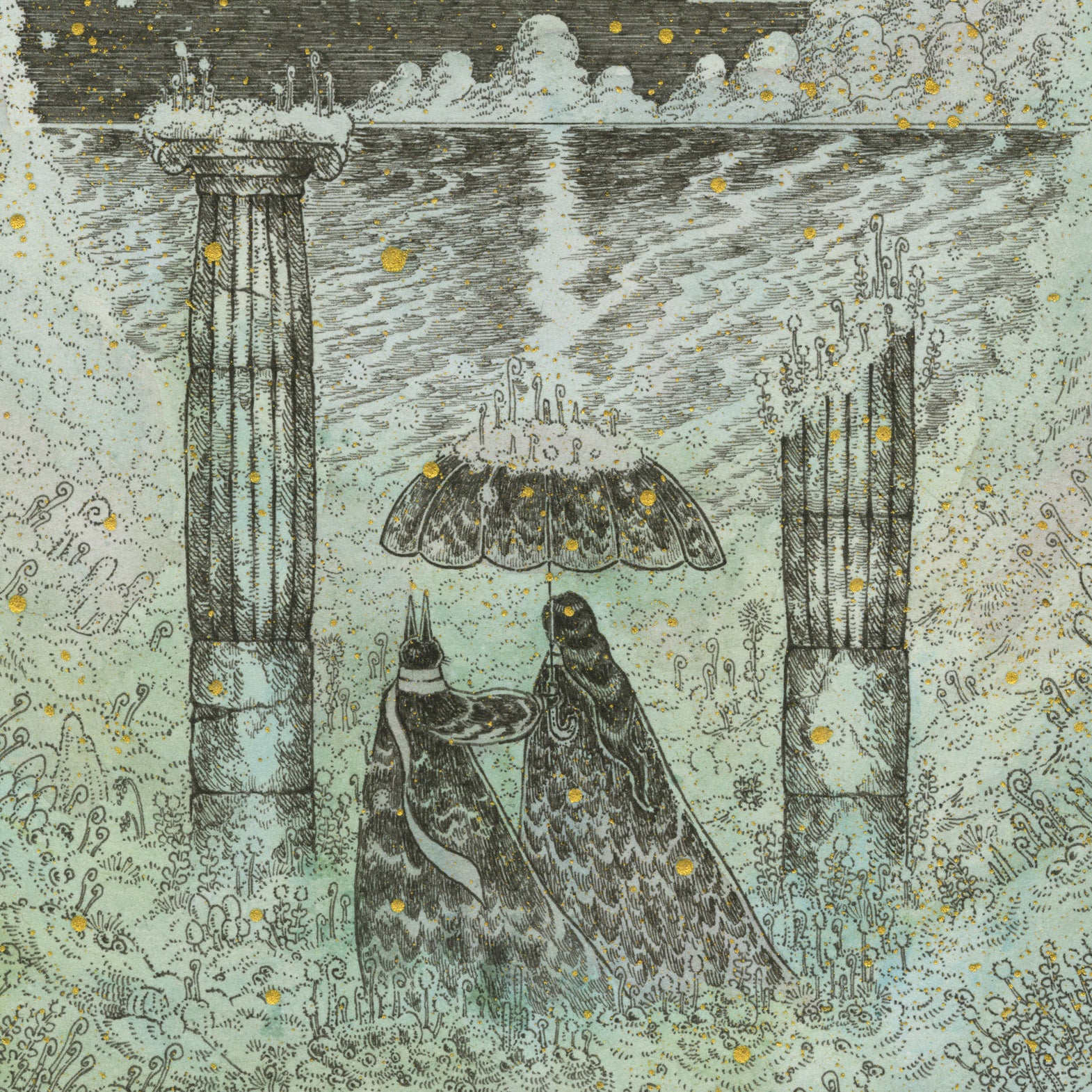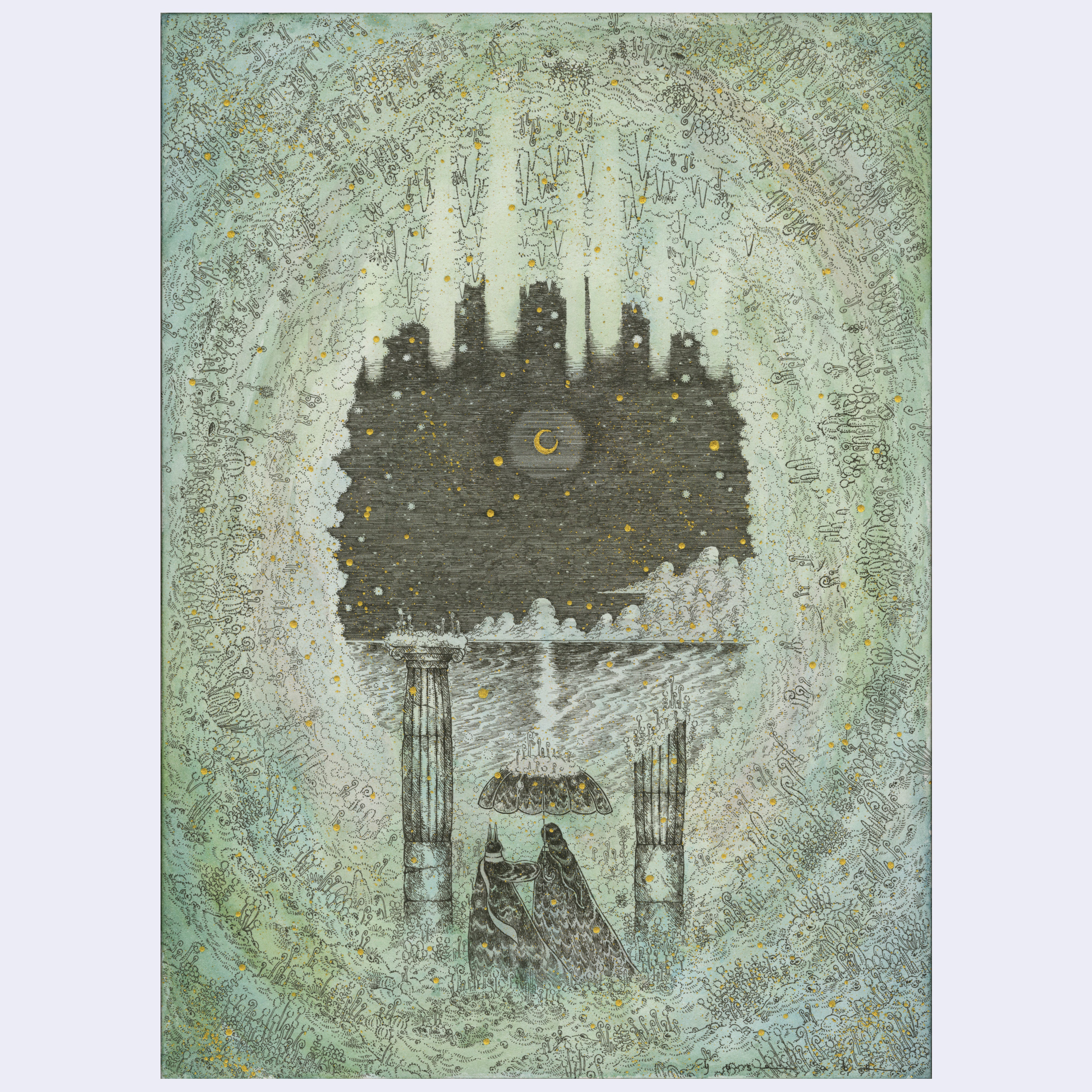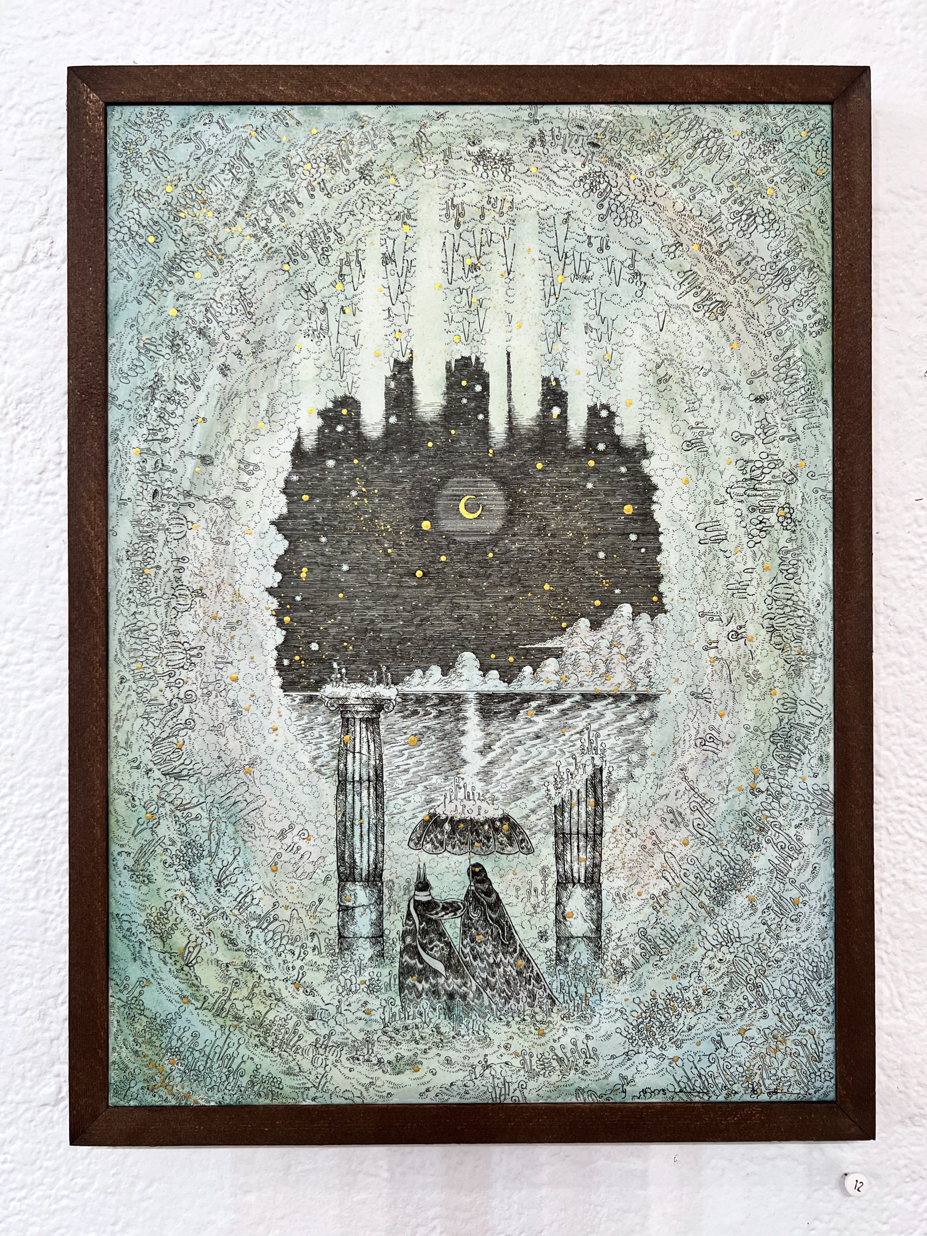 Pen, watercolor & gold ink on washi paper. Piece is framed.