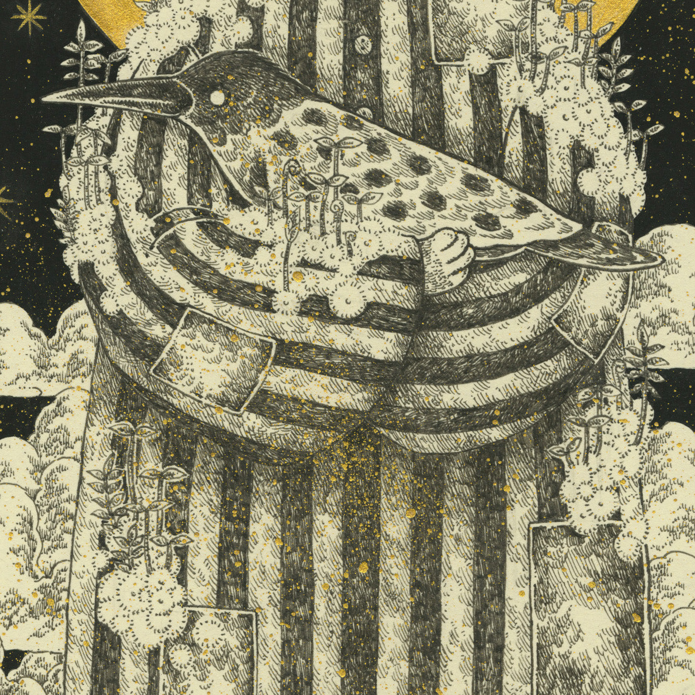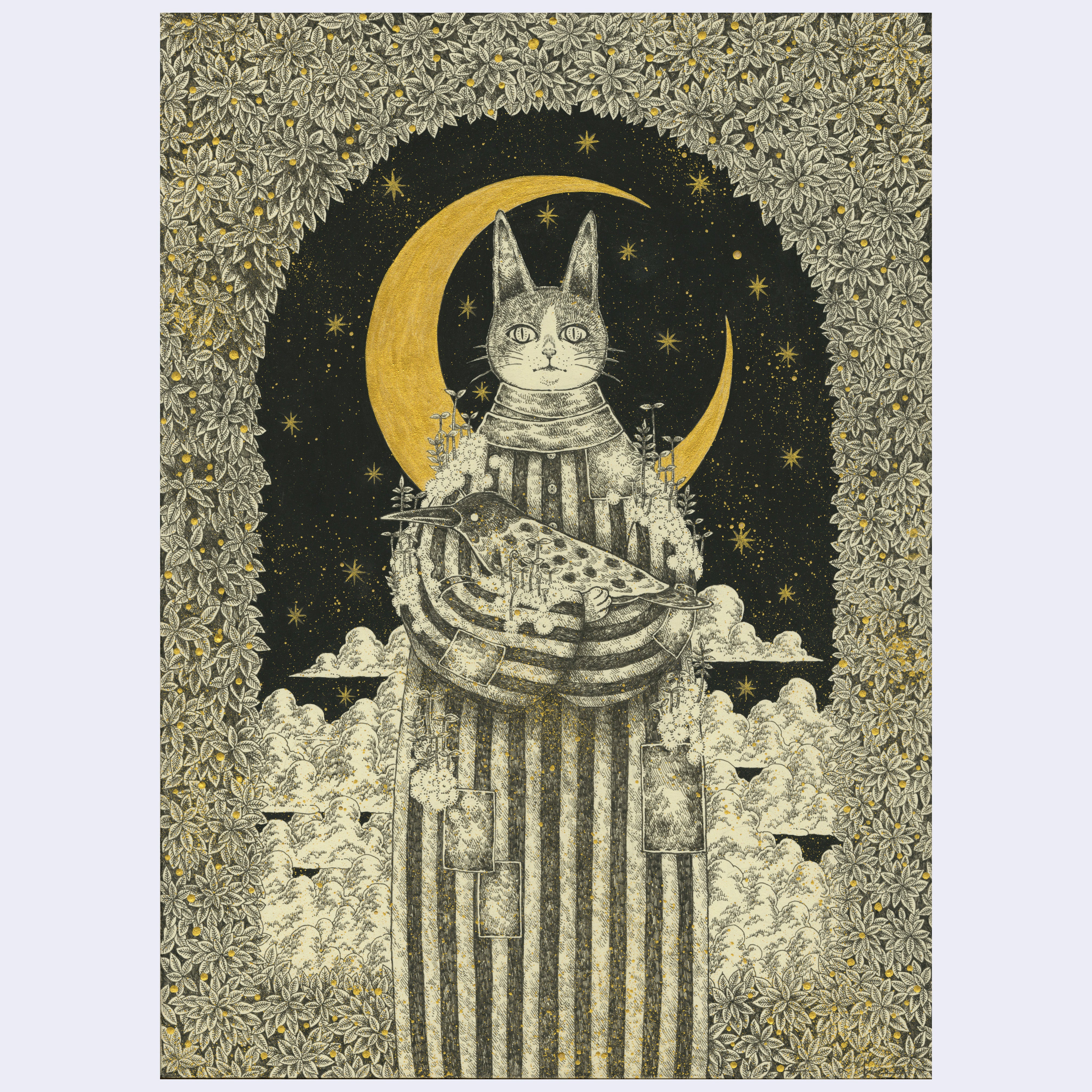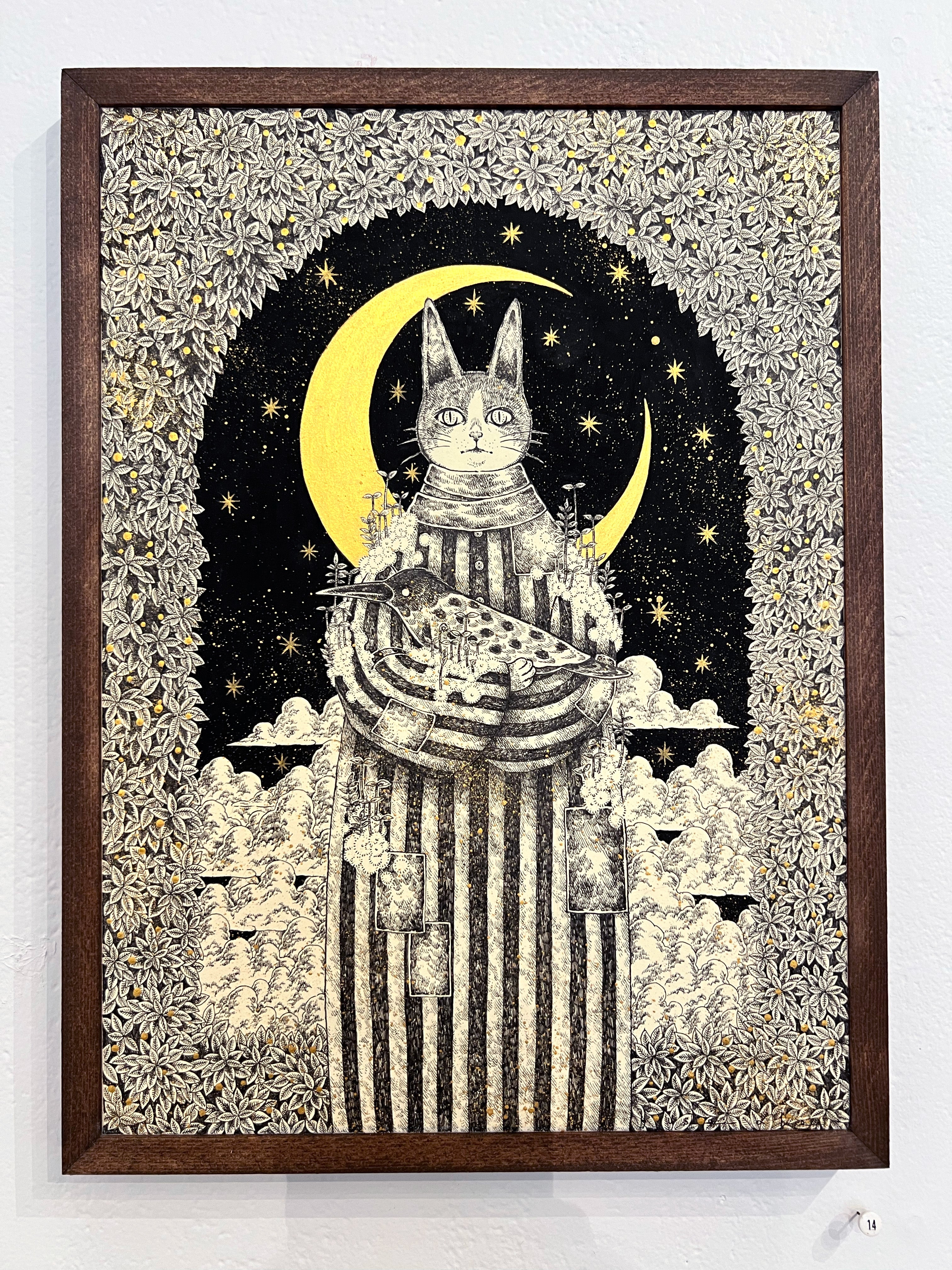 Pen, gouache & gold ink on washi paper. Piece is framed.