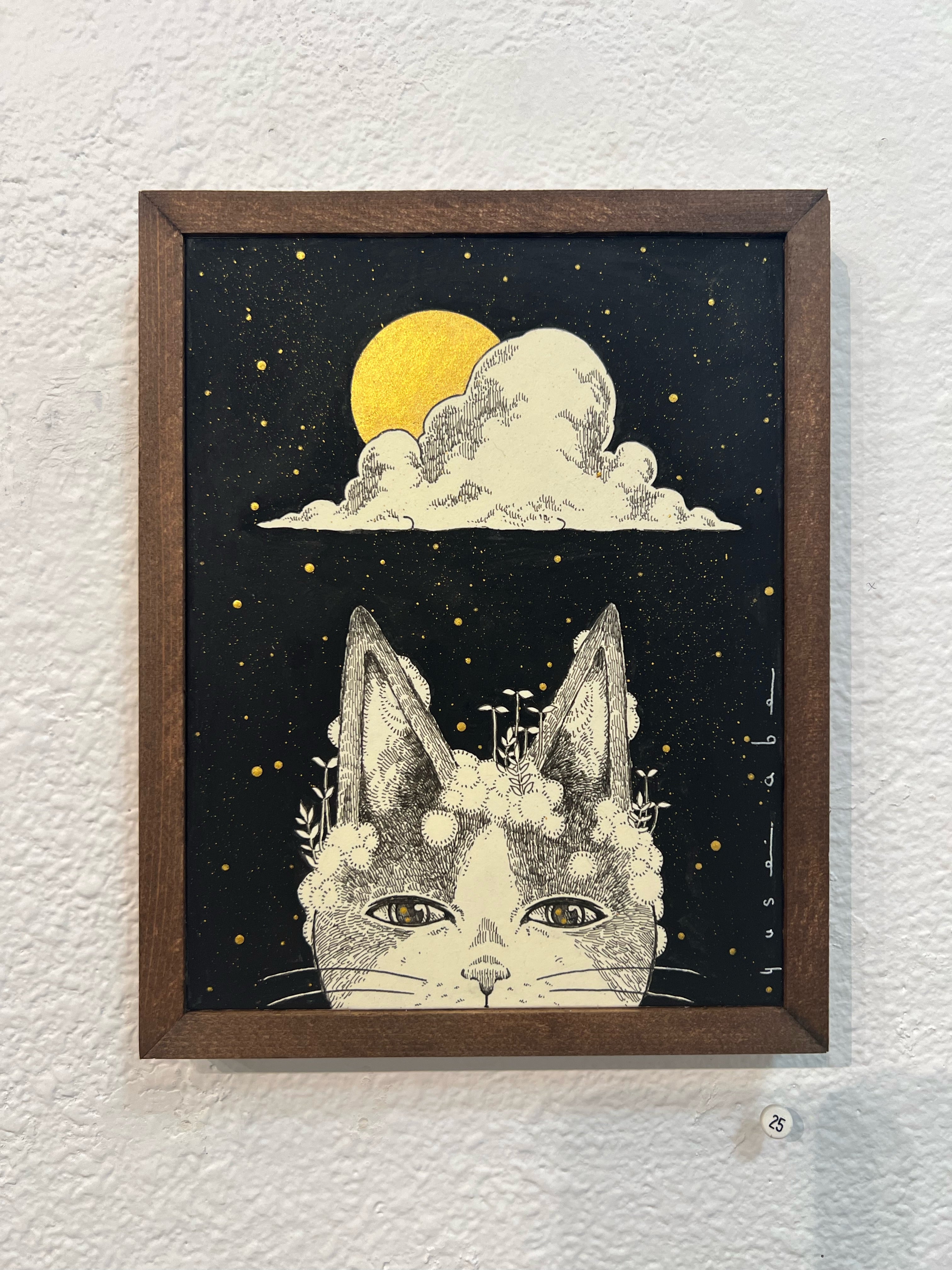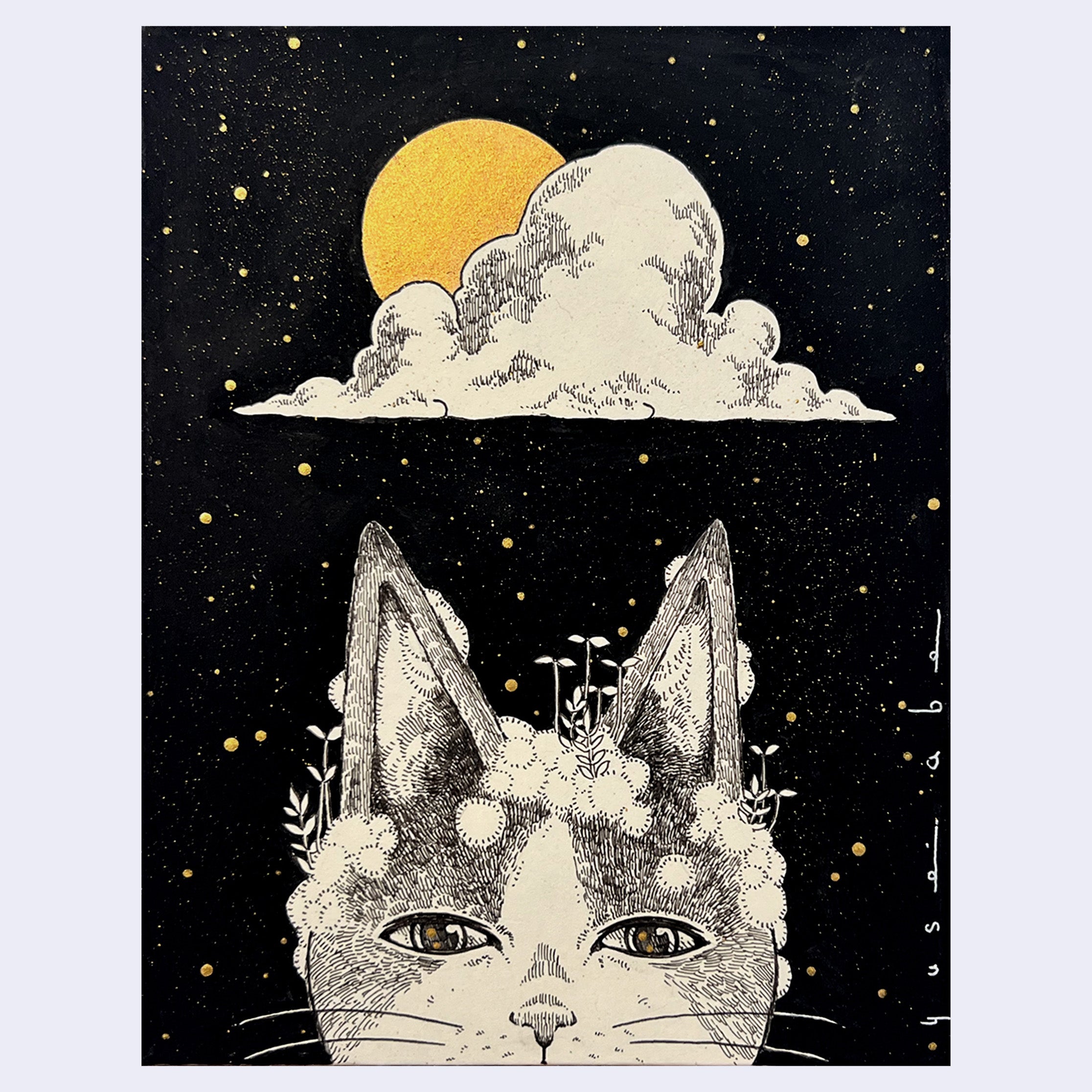 Black ink illustration of a cat portrait, seen only from the nose up. Greenery sprouts atop its head. A single fluffy cloud and a gold moon are overhead.