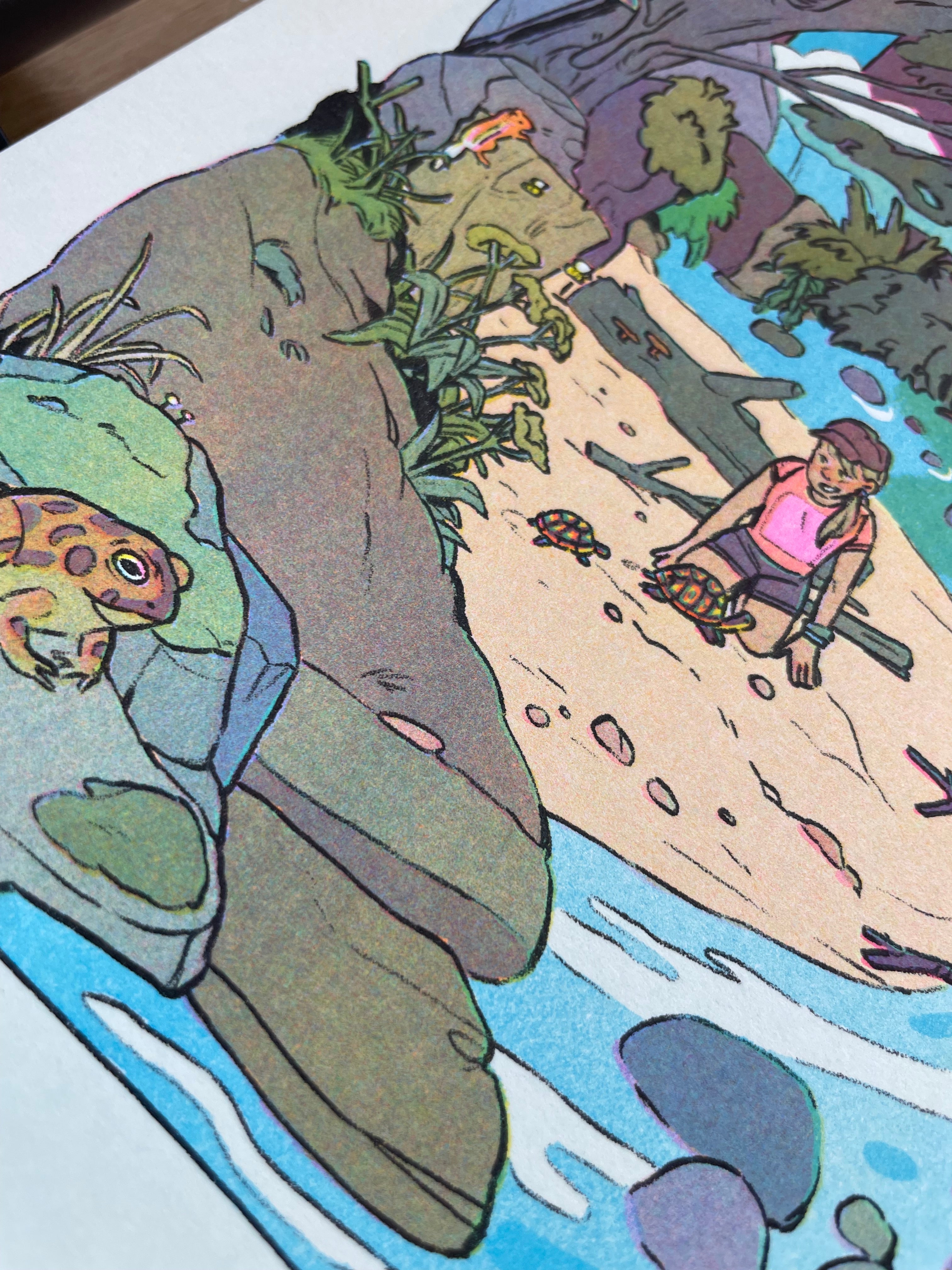 4 color (Flo Pink, Yellow, Medium Blue and Black) risograph.