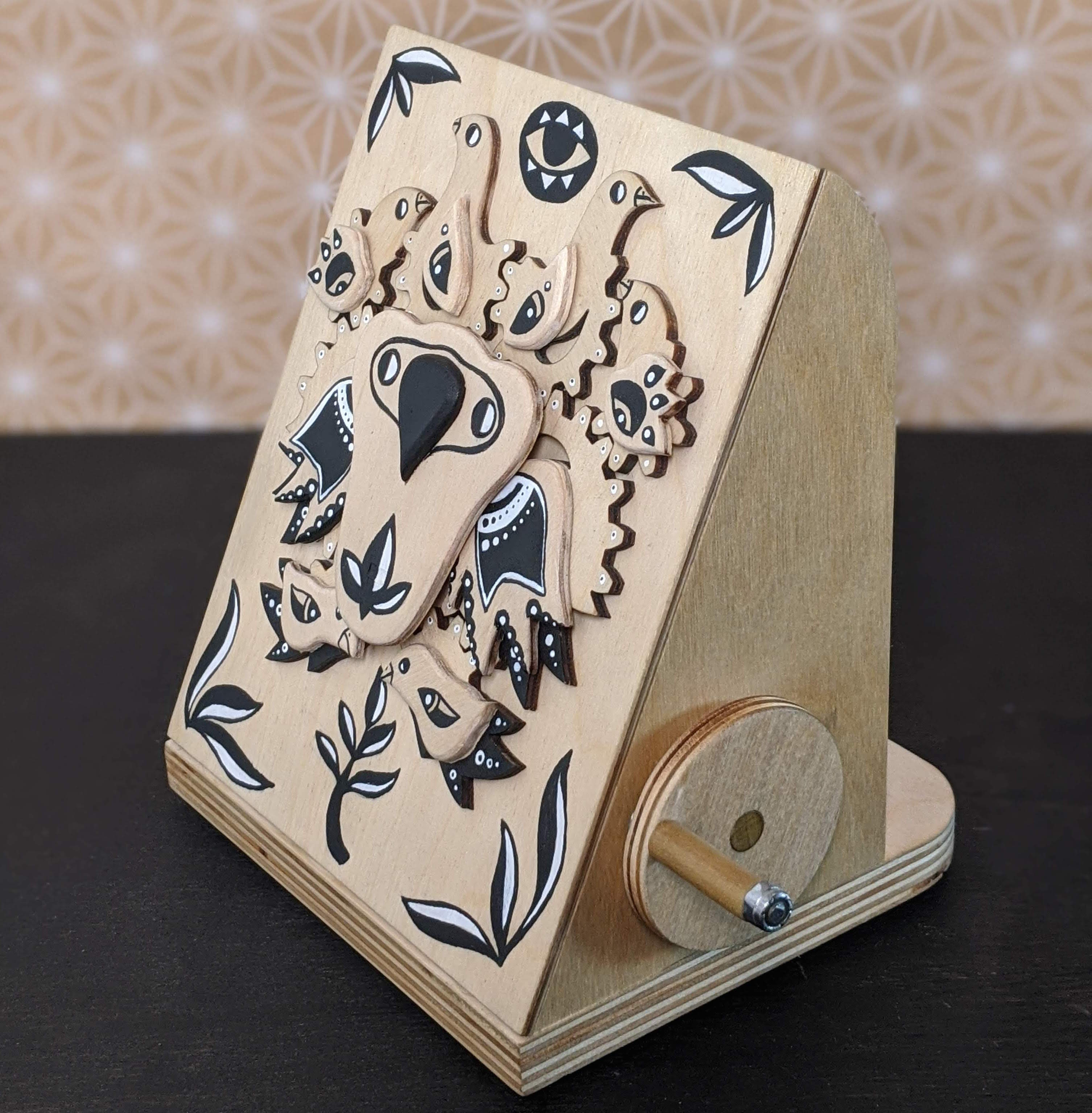 Artwork measures 5.5 x 6.75 x 5 inches, Baltic Birch Plywood and Acrylic Ink.
