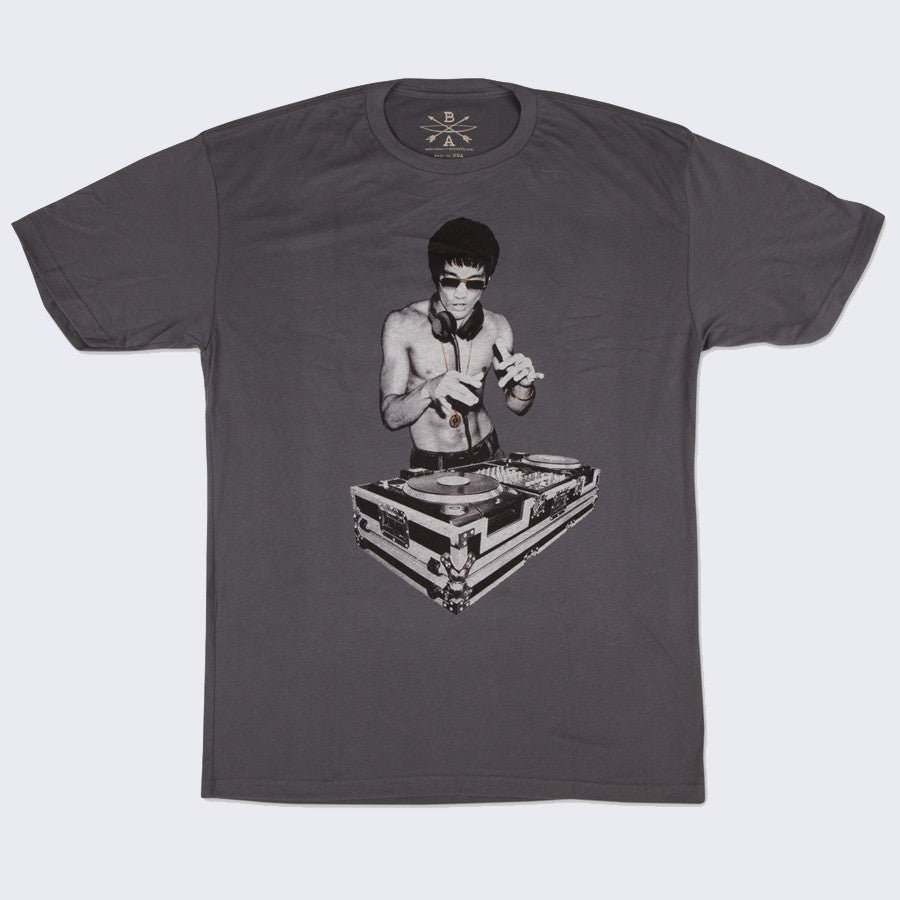 The iconic image of Bruce Lee as a DJ is back! Some images never go out of style and classic inspirations continue to this day. Water based inks, soft t-shirt. 50/50 Cotton, poly blend.