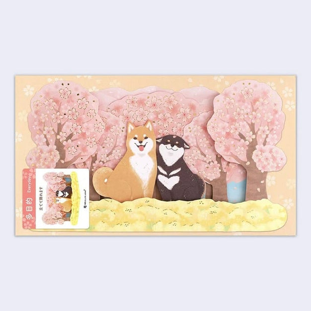 3D paper greeting card of many cherry blossom trees and 2 shiba inu dogs sitting in front of them, one smiles and the other has its tongue out.