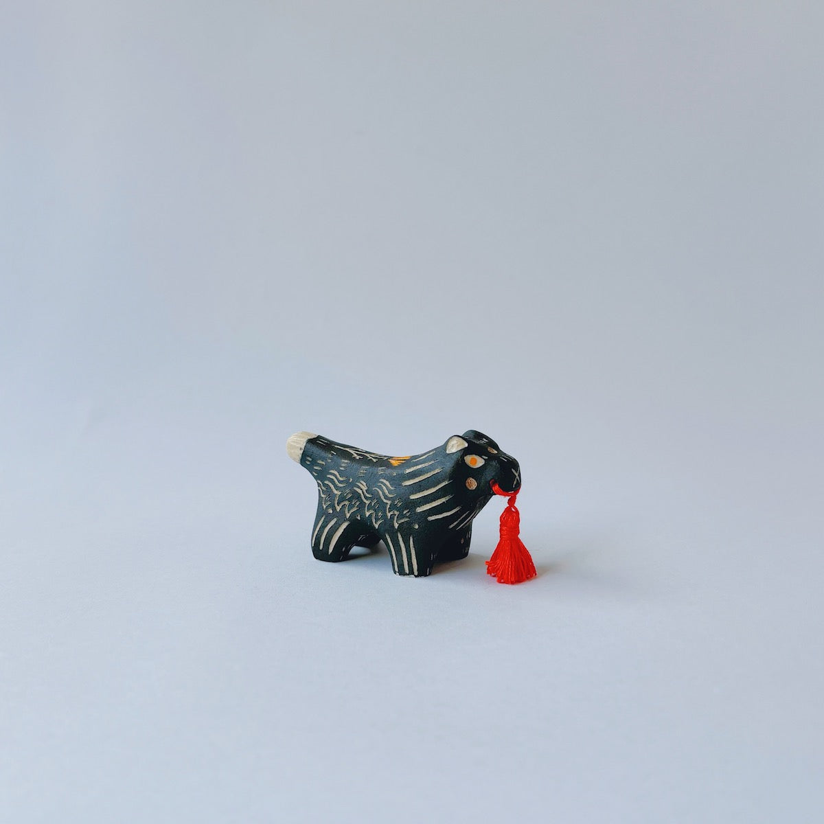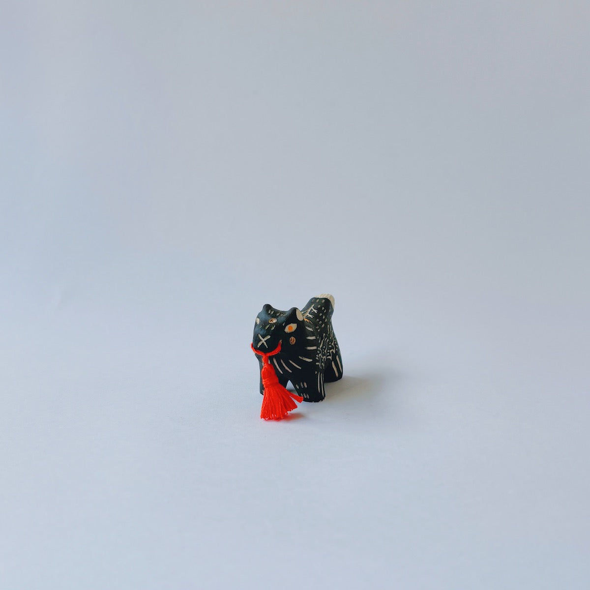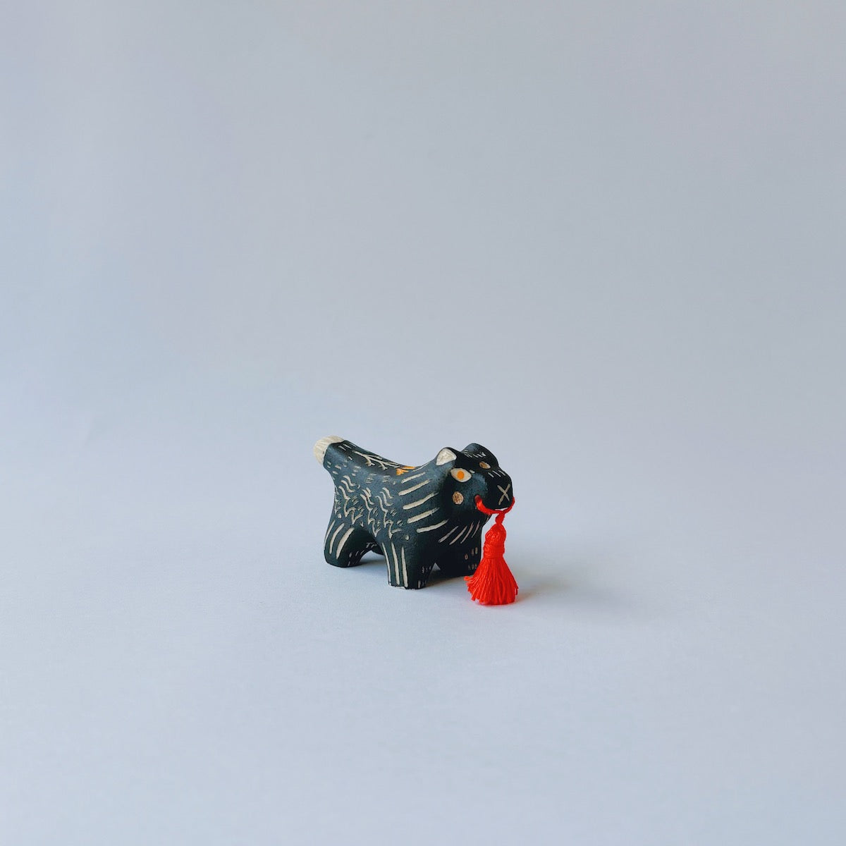Small black ceramic sculpture of a wolf-like animal with a red tassel hanging from its mouth.