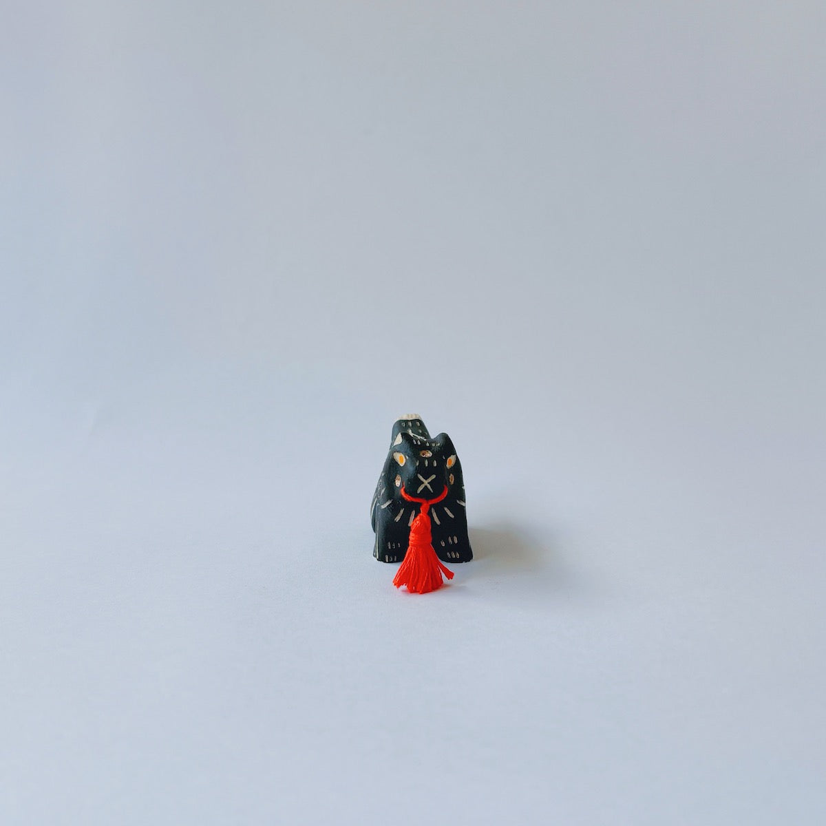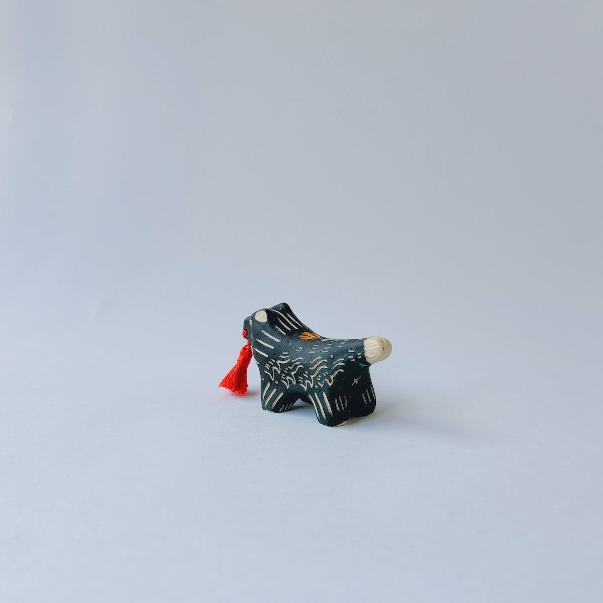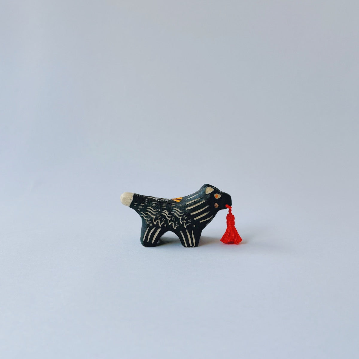 Small black ceramic sculpture of a wolf-like animal with a red tassel hanging from its mouth.