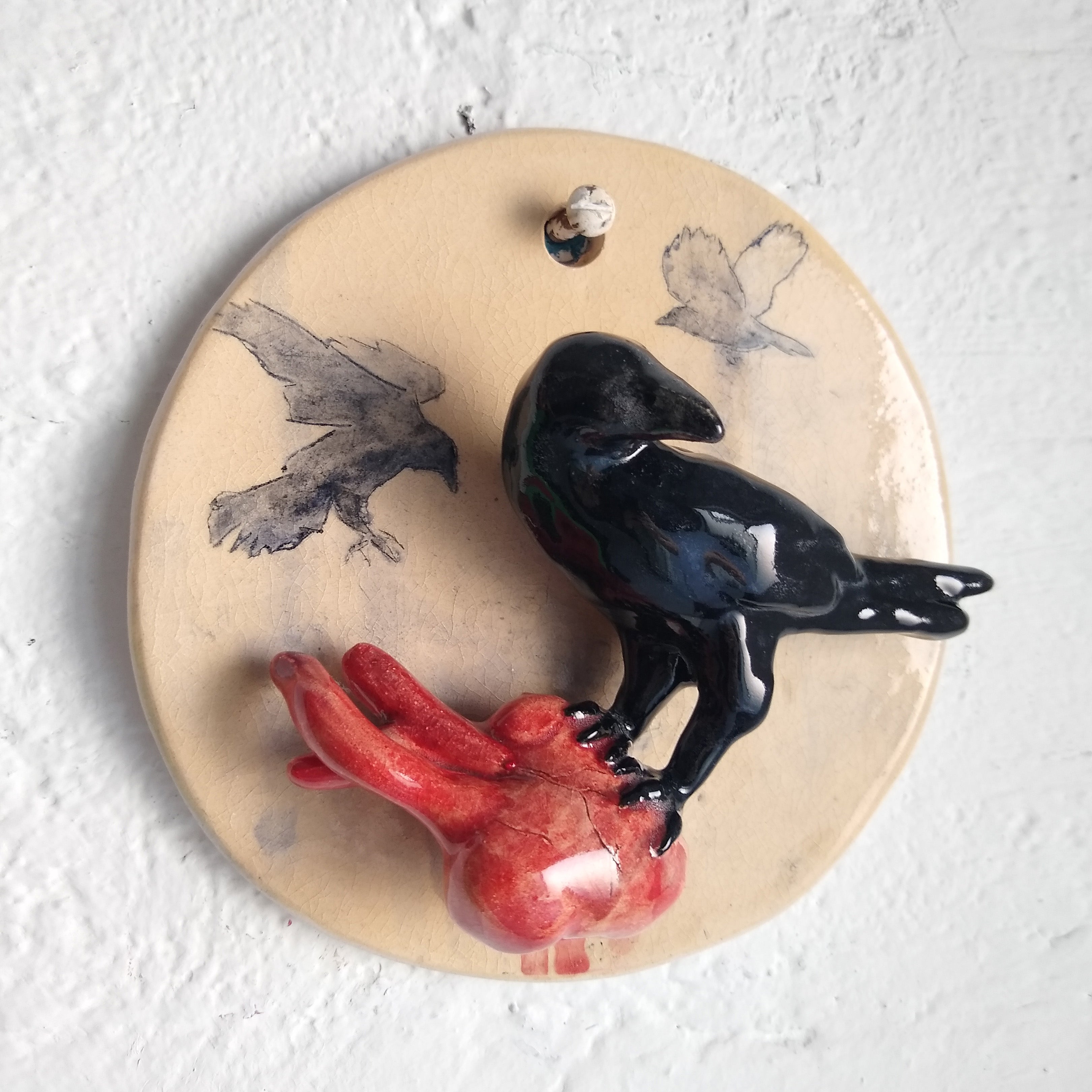 Ceramic sculpture of a cream colored circle disk, with a black crow standing atop of a bleeding human heart. Both the crow and the heart are 3D and jut out from the circle.