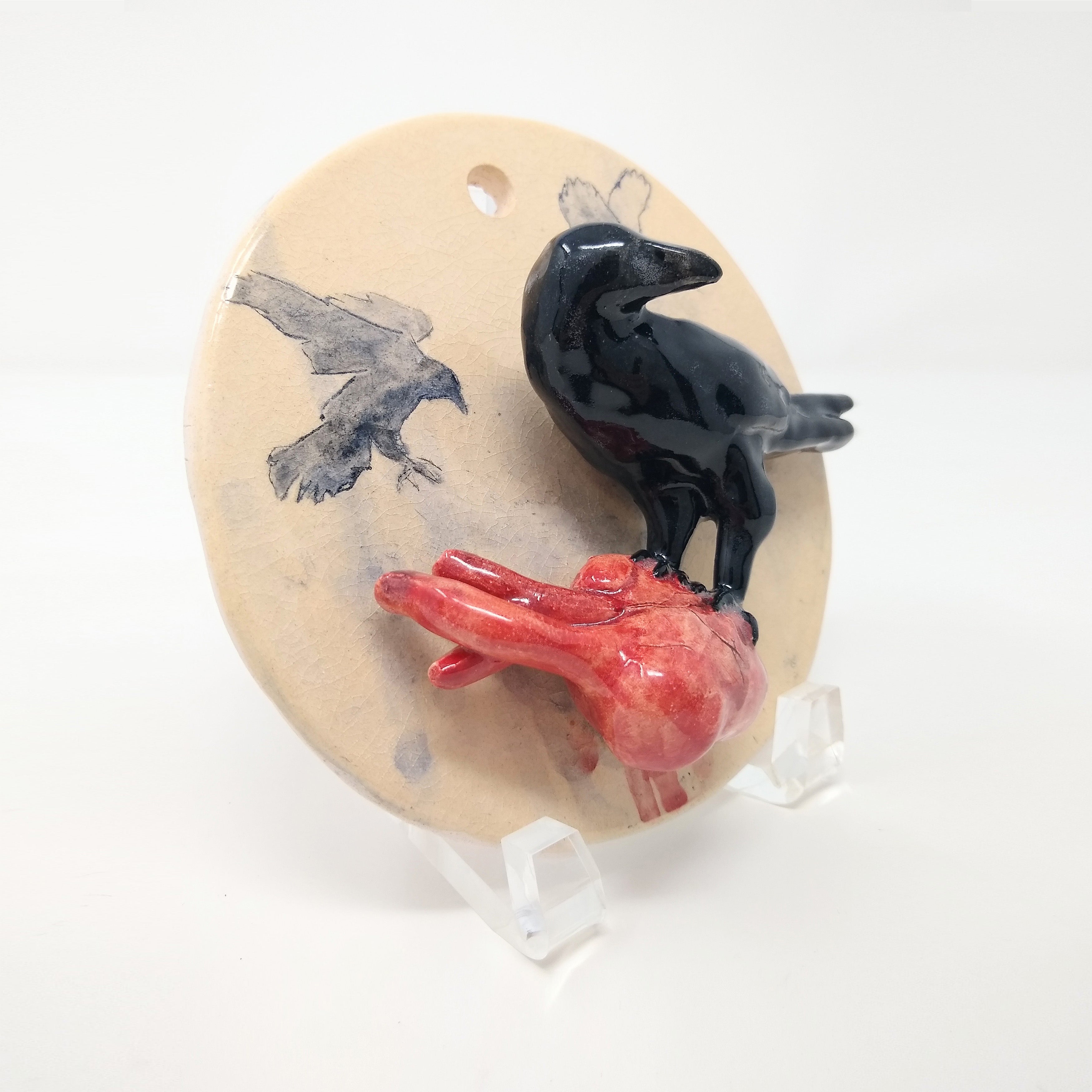Ceramic sculpture of a cream colored circle disk, with a black crow standing atop of a bleeding human heart. Both the crow and the heart are 3D and jut out from the circle. Shown at the side to display three dimensionality.