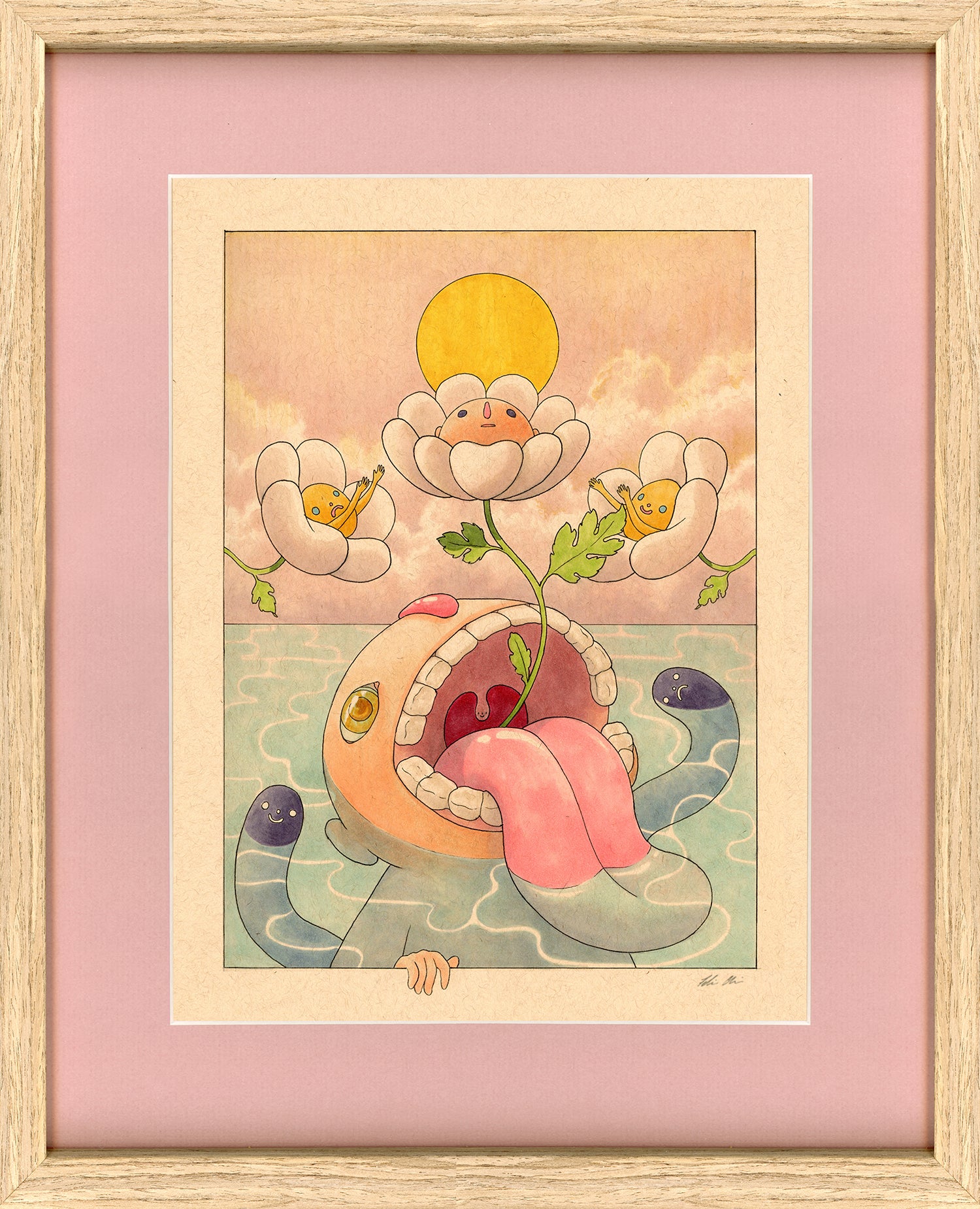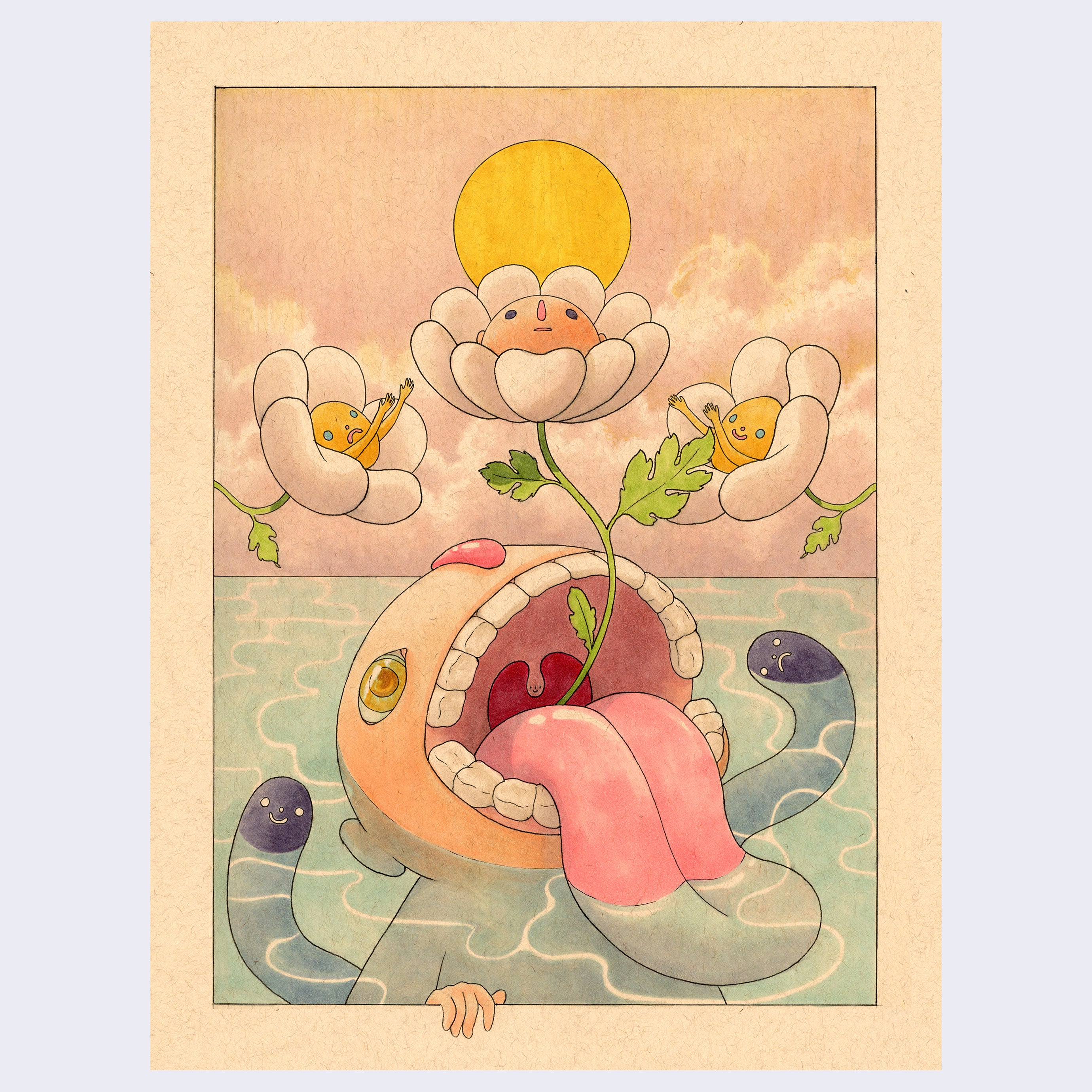 Illustration on tan toned paper. A large semi anthropomorphic character with glossy eyes emerges from a body of water, with a wide open mouth and large tongue falling out of it. Coming from its throat is a stemmed daisy with a semi anthropomorphic face. On either side are stemmed daisies reaching their arms out towards the face. Two black worm creatures swim in the water.