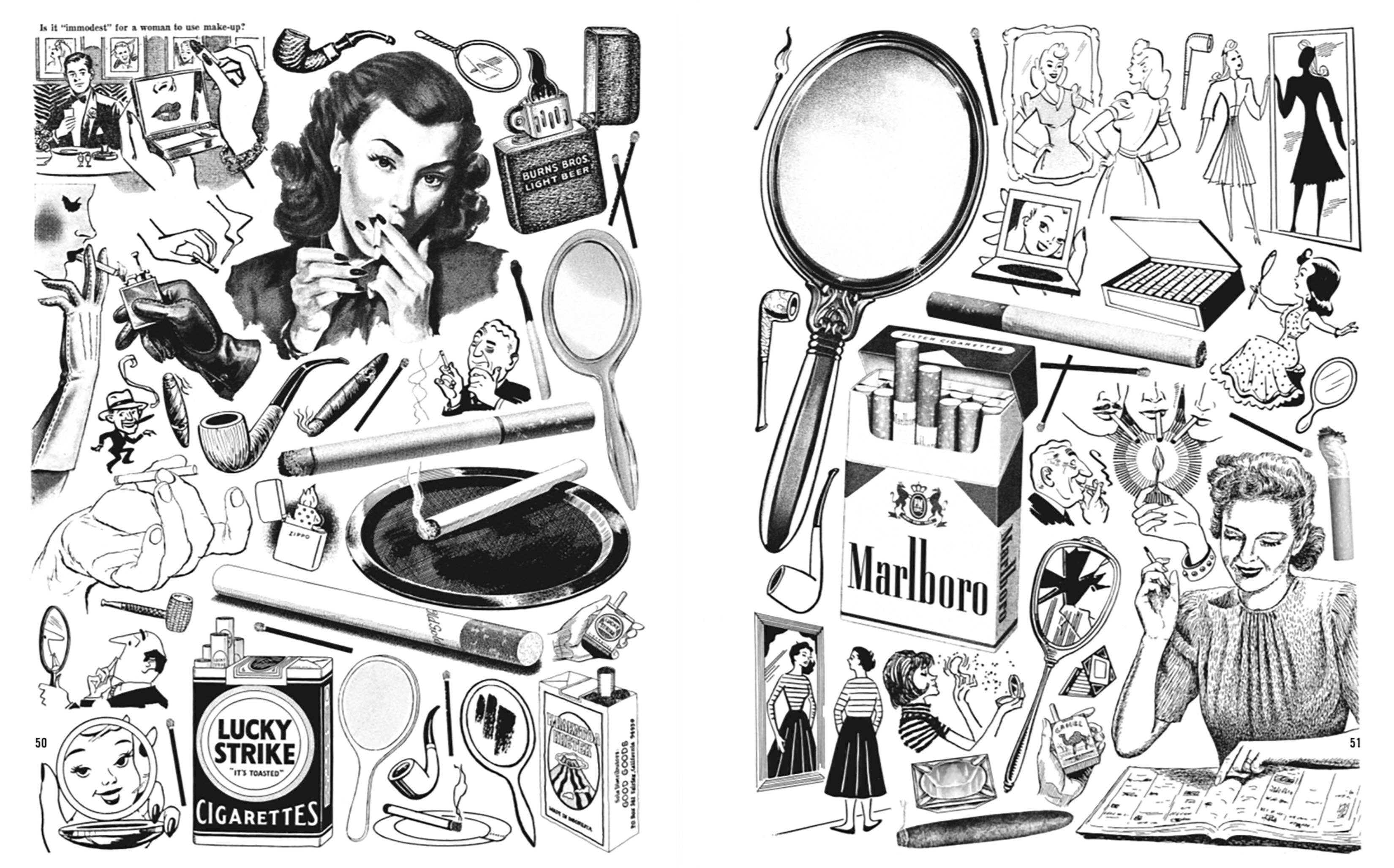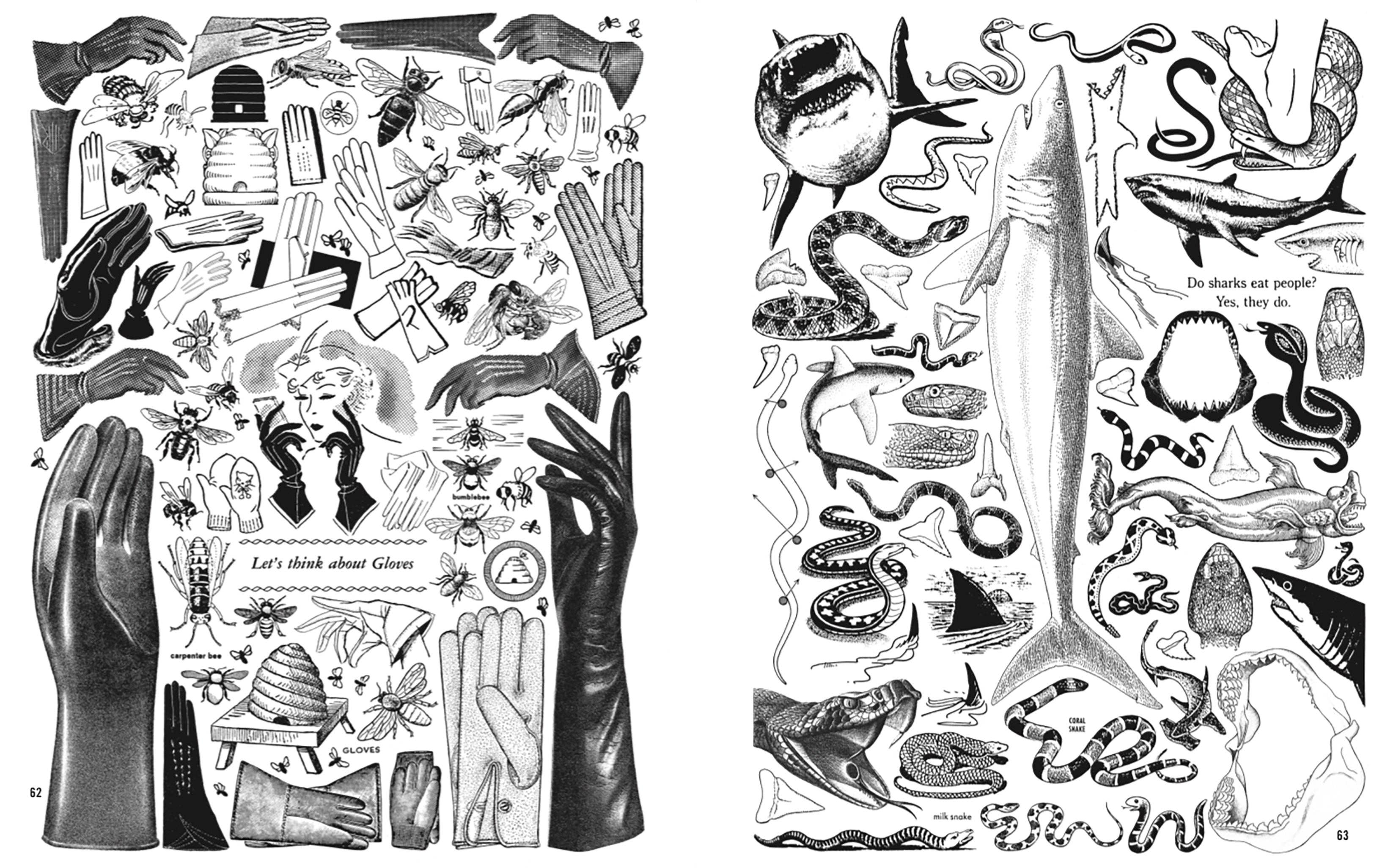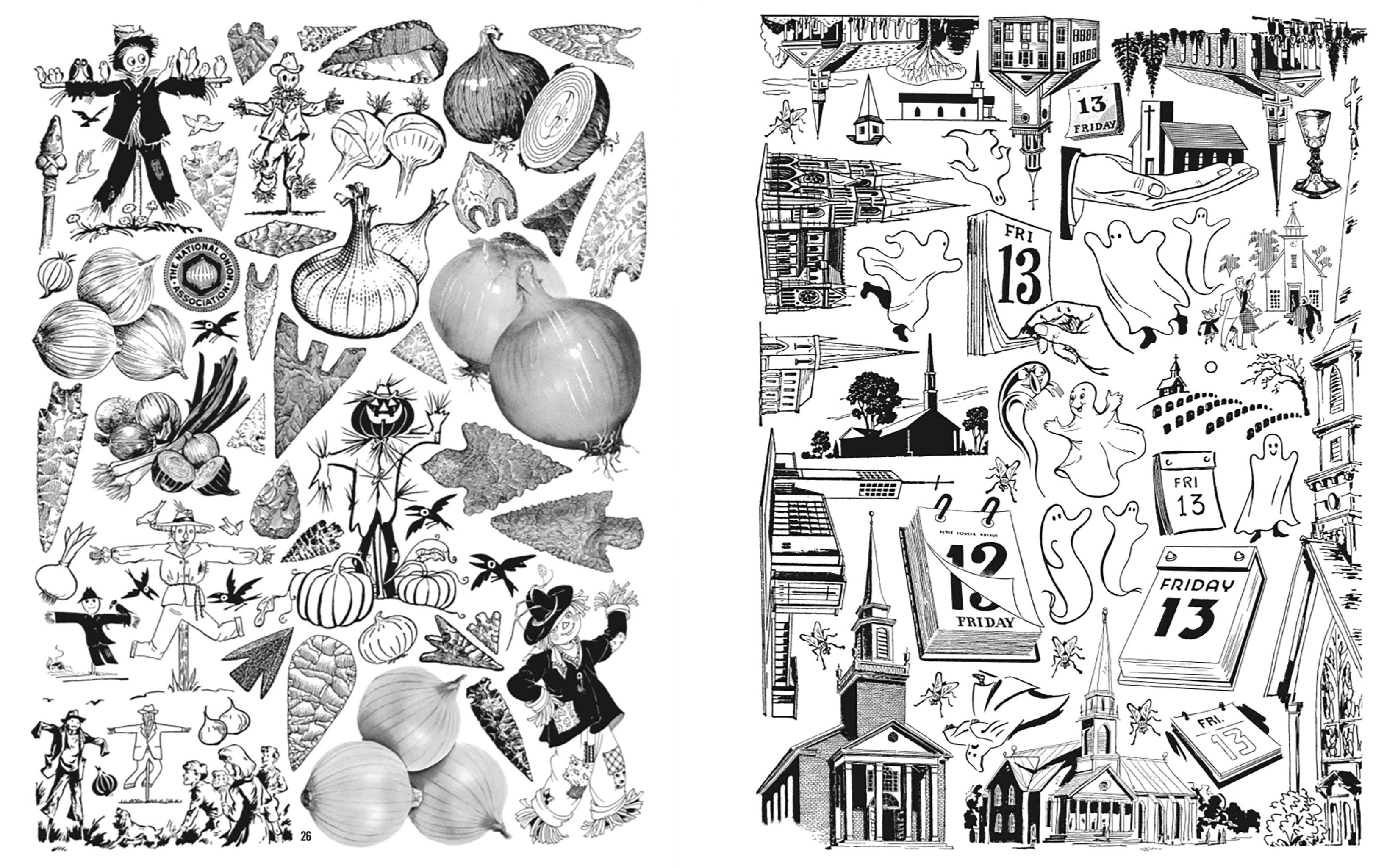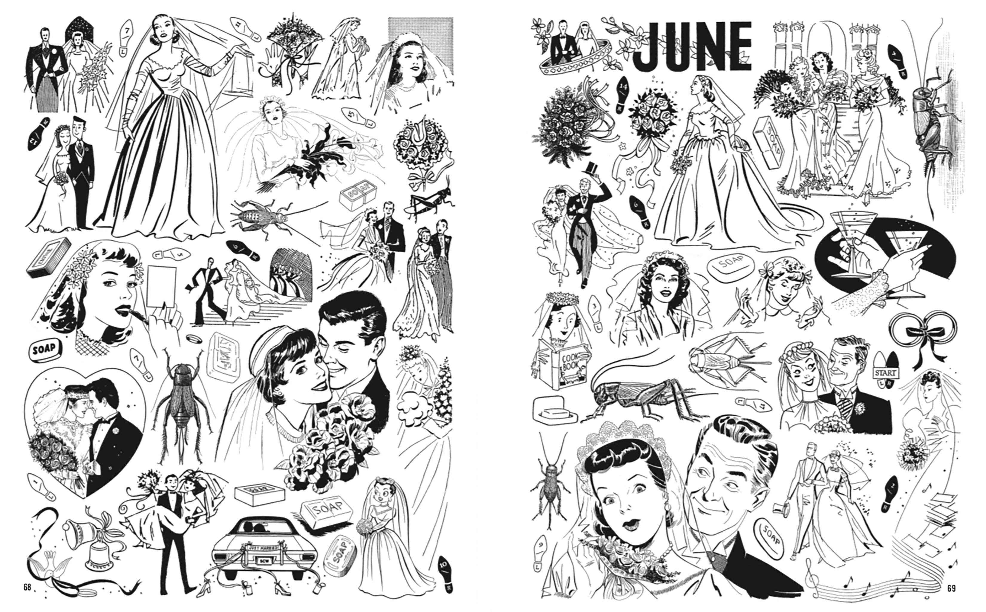 Each page is filled with high-contrast line art, culled from vintage catalogs, advertising, obscure books, and found ephemera.
