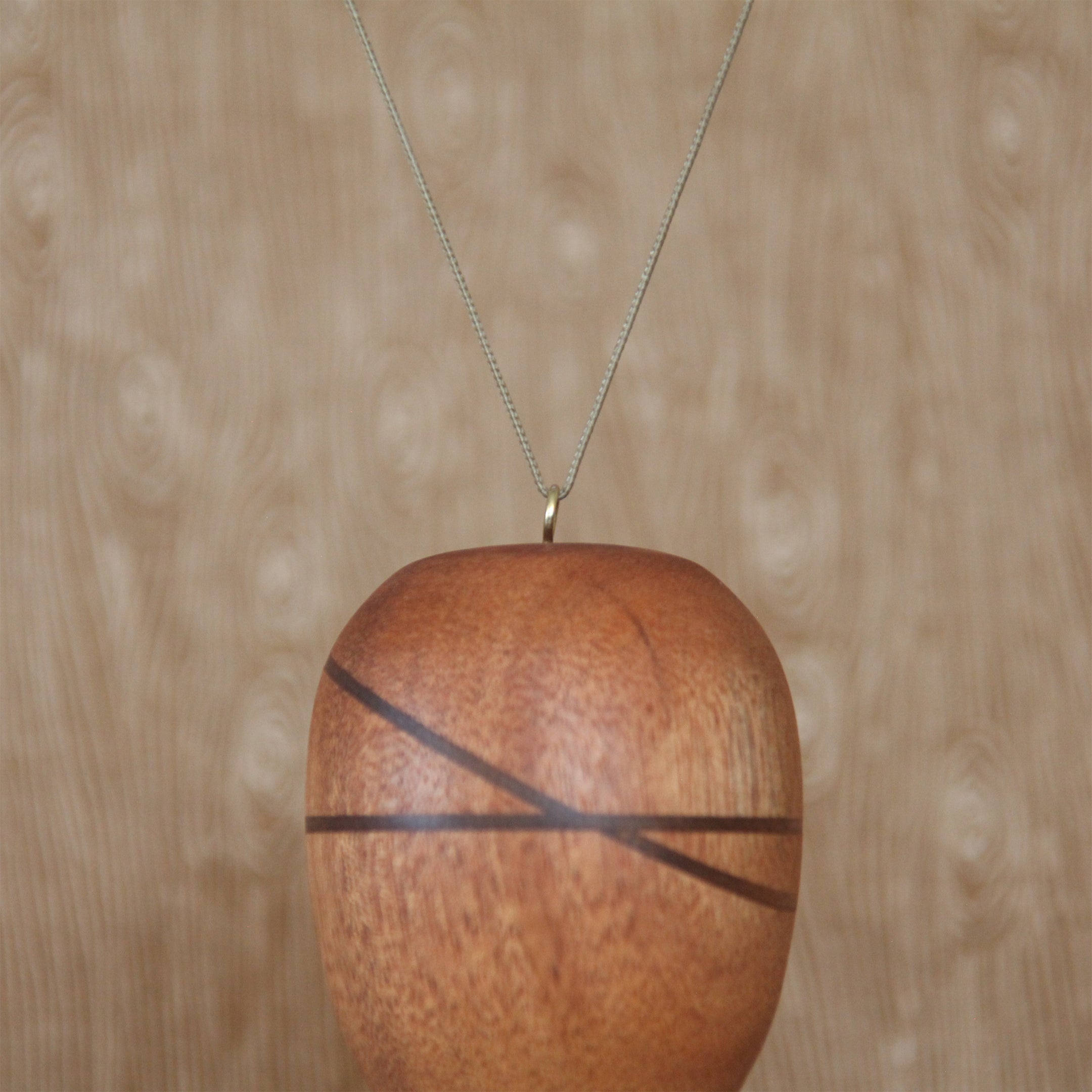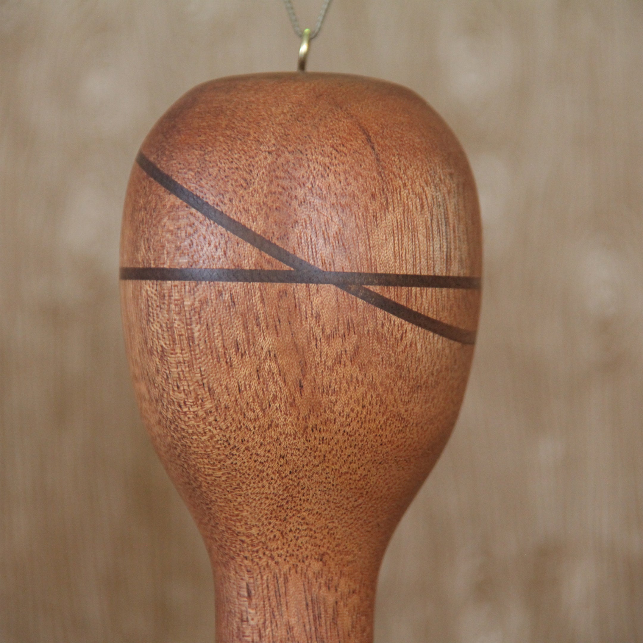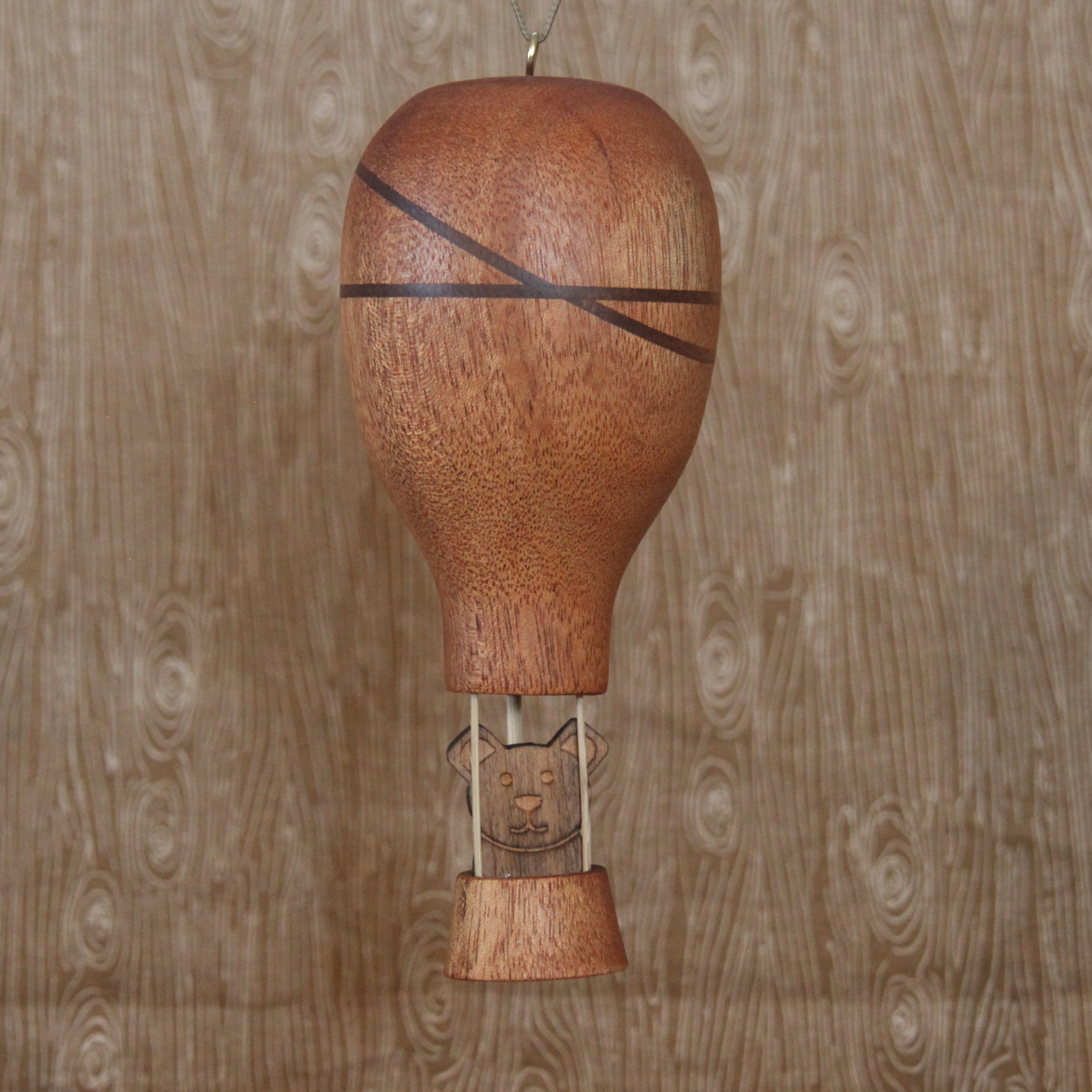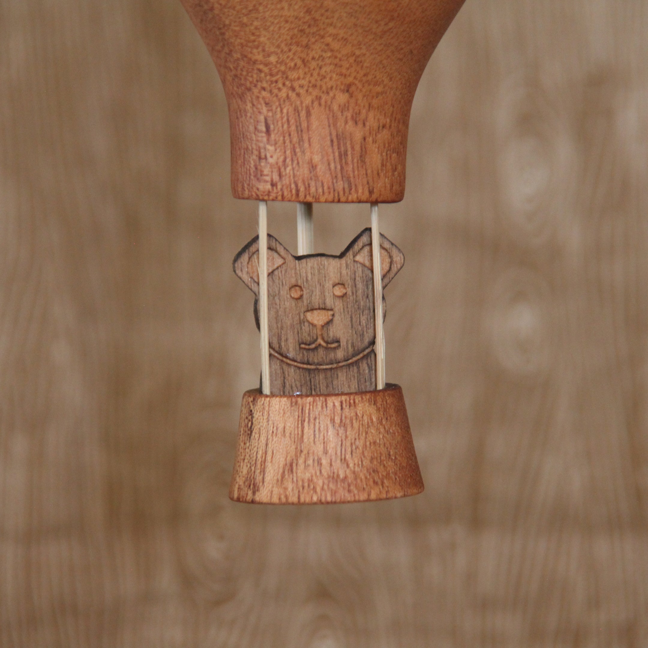 Wooden sculpture of a hot air ballon with a small bear sitting in the basket.