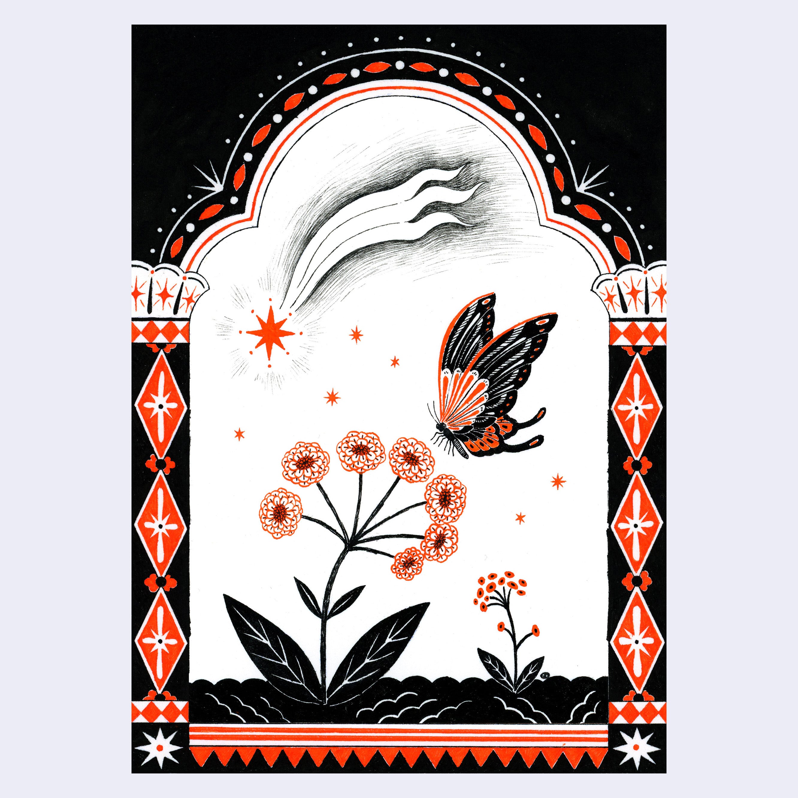 Dip pen and sumi ink on watercolor paper mounted on a wood panel.