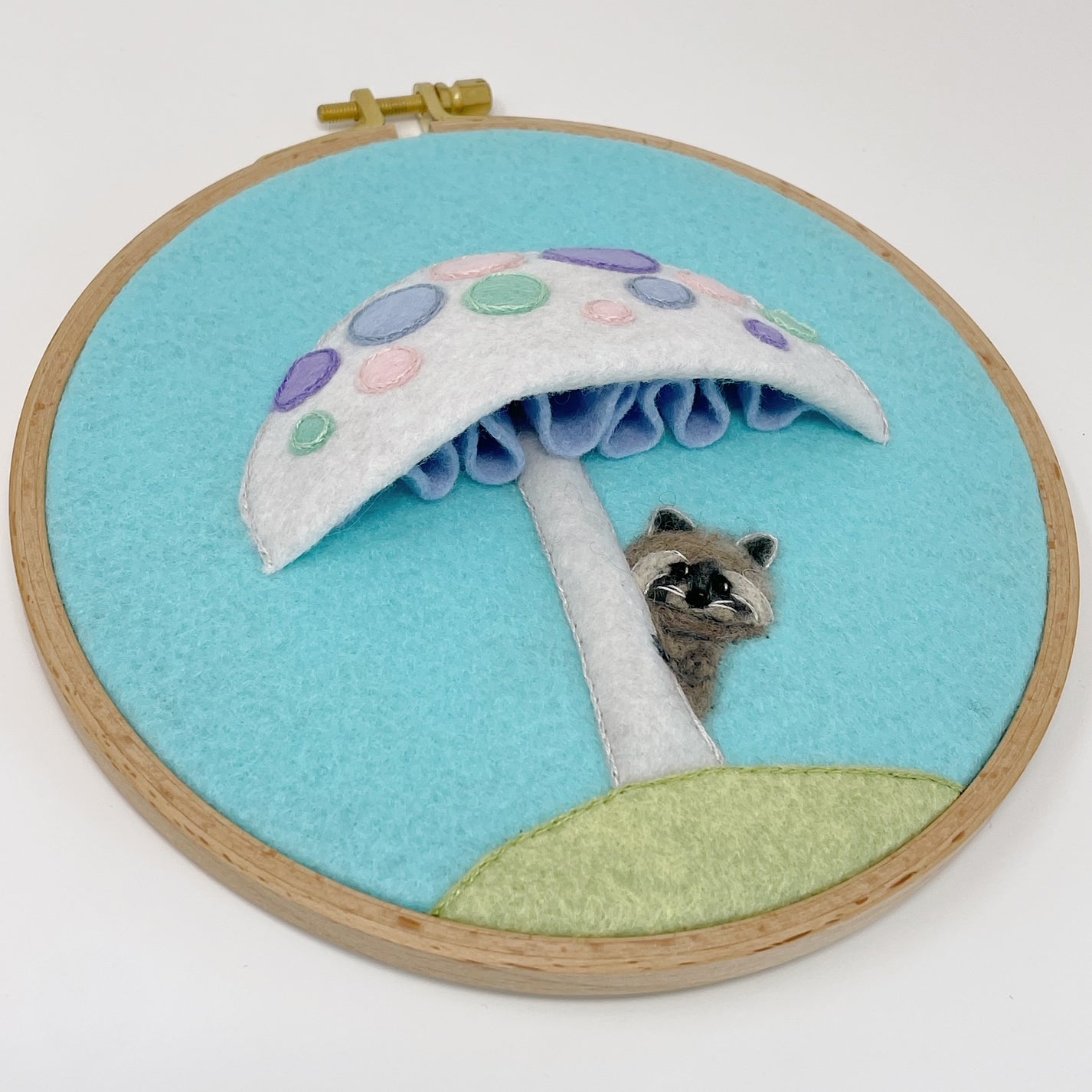 Wool roving and thread on felt. Framed in an embroidery hoop.