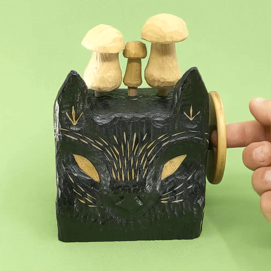 Gif of a wooden, block shaped black wolf head with small details carved exposing the natural wood. A handle on the right is being turned and is making the 3 wooden mushrooms atop its head move up and down.