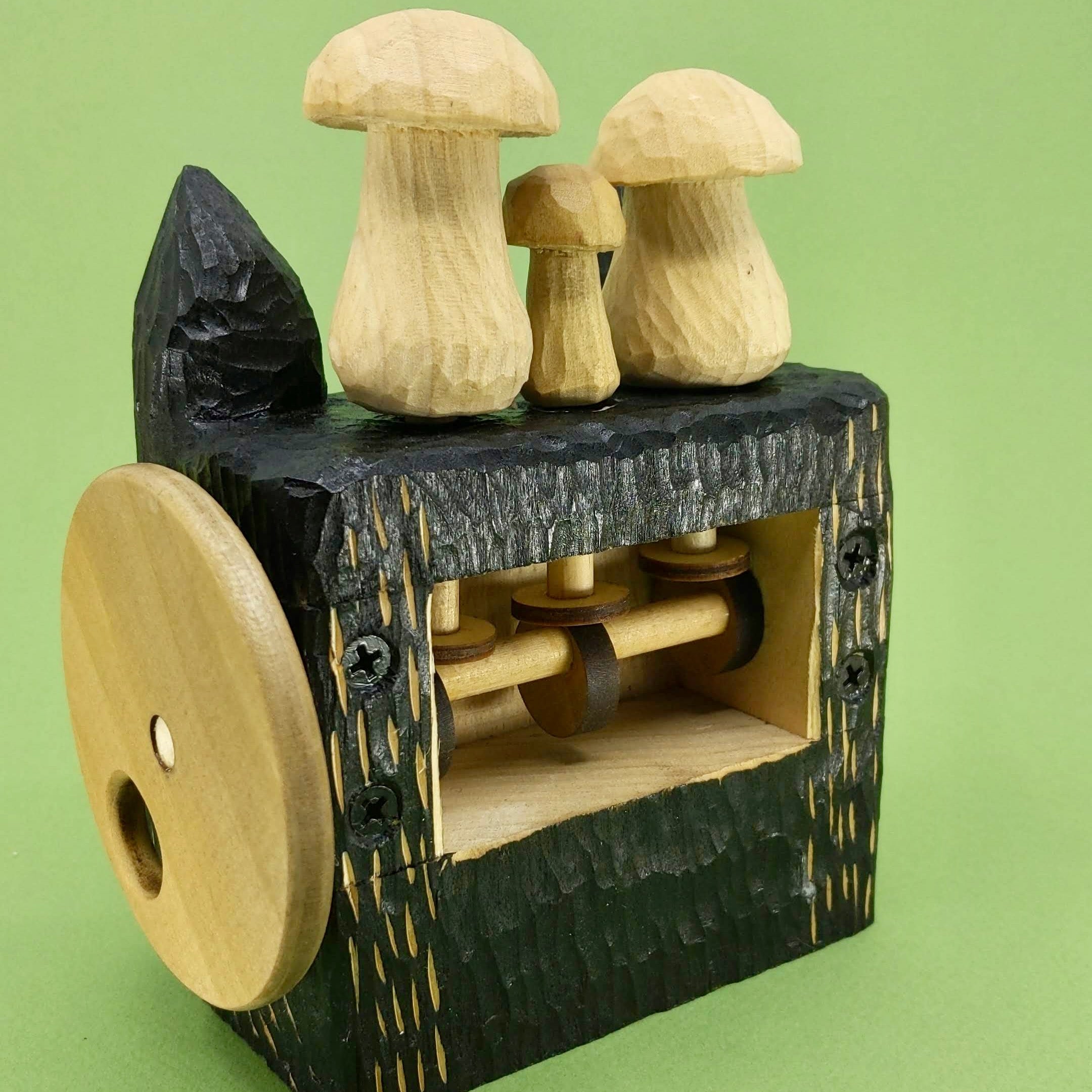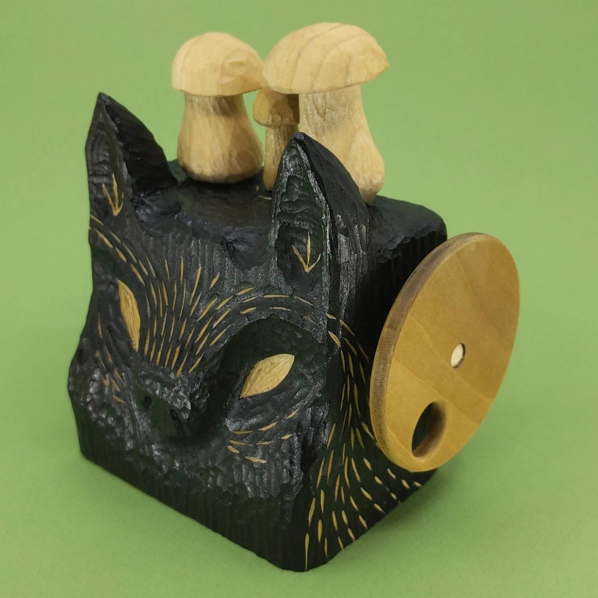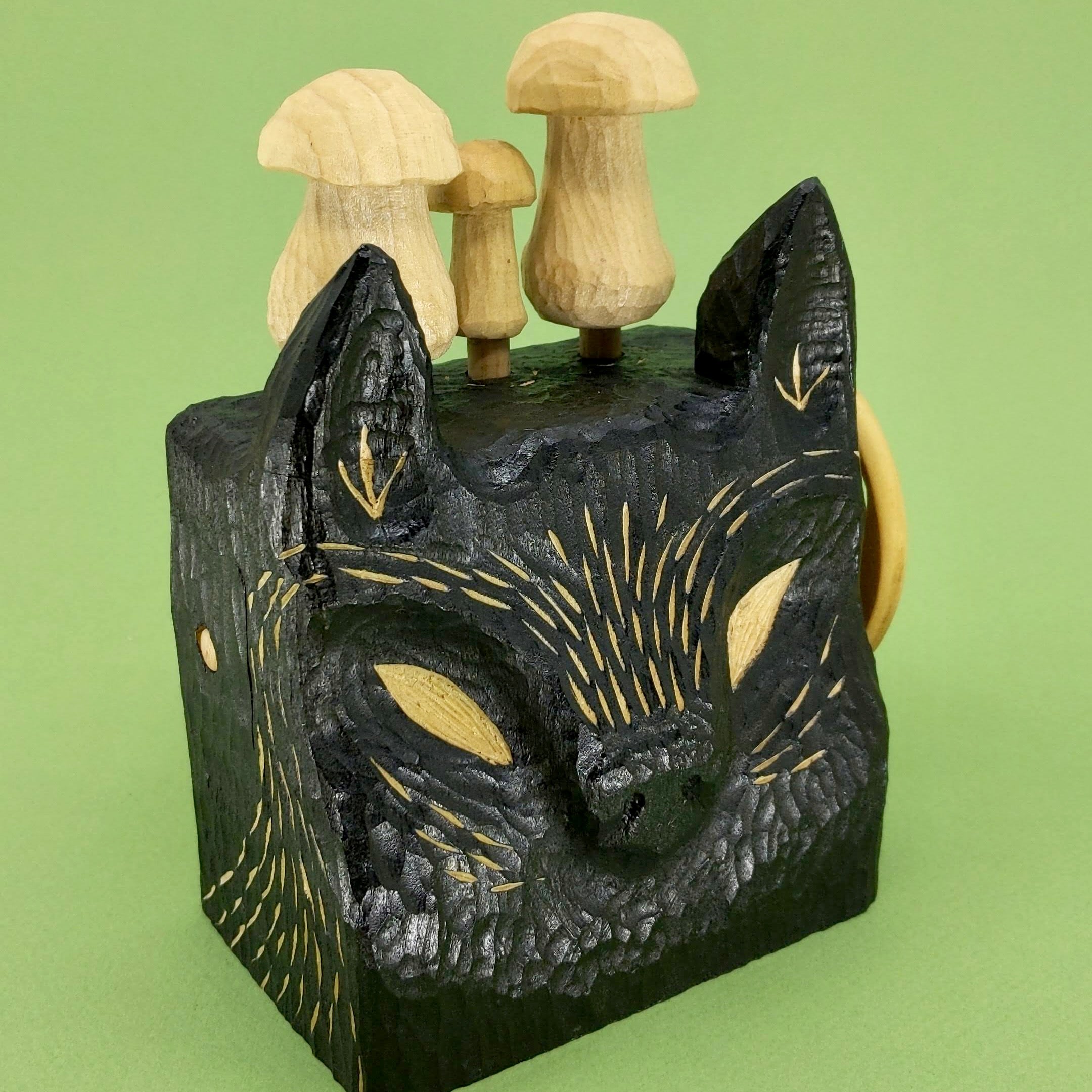A wooden, block shaped black wolf head with small details carved exposing the natural wood, there are 3 wooden mushrooms atop its head and a turnable disc handle on the side.