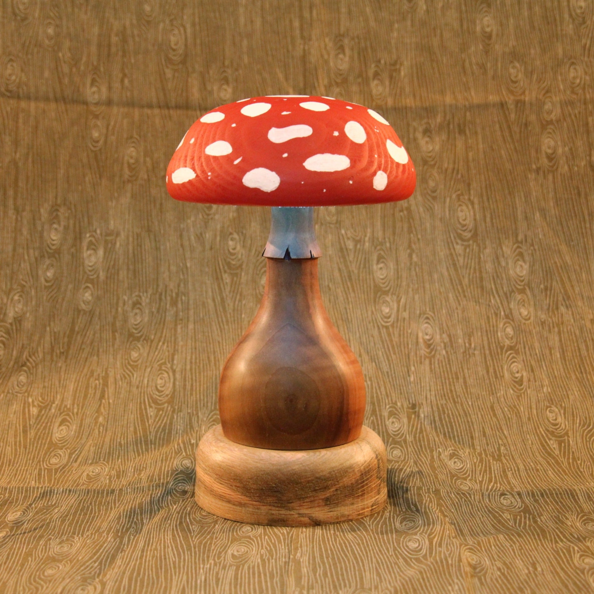 Carved wooden mushroom, with a thick and smooth wooden base. The top of the mushroom is red with while polka dots. Sculpture is also a lamp, emitting a dim glow.