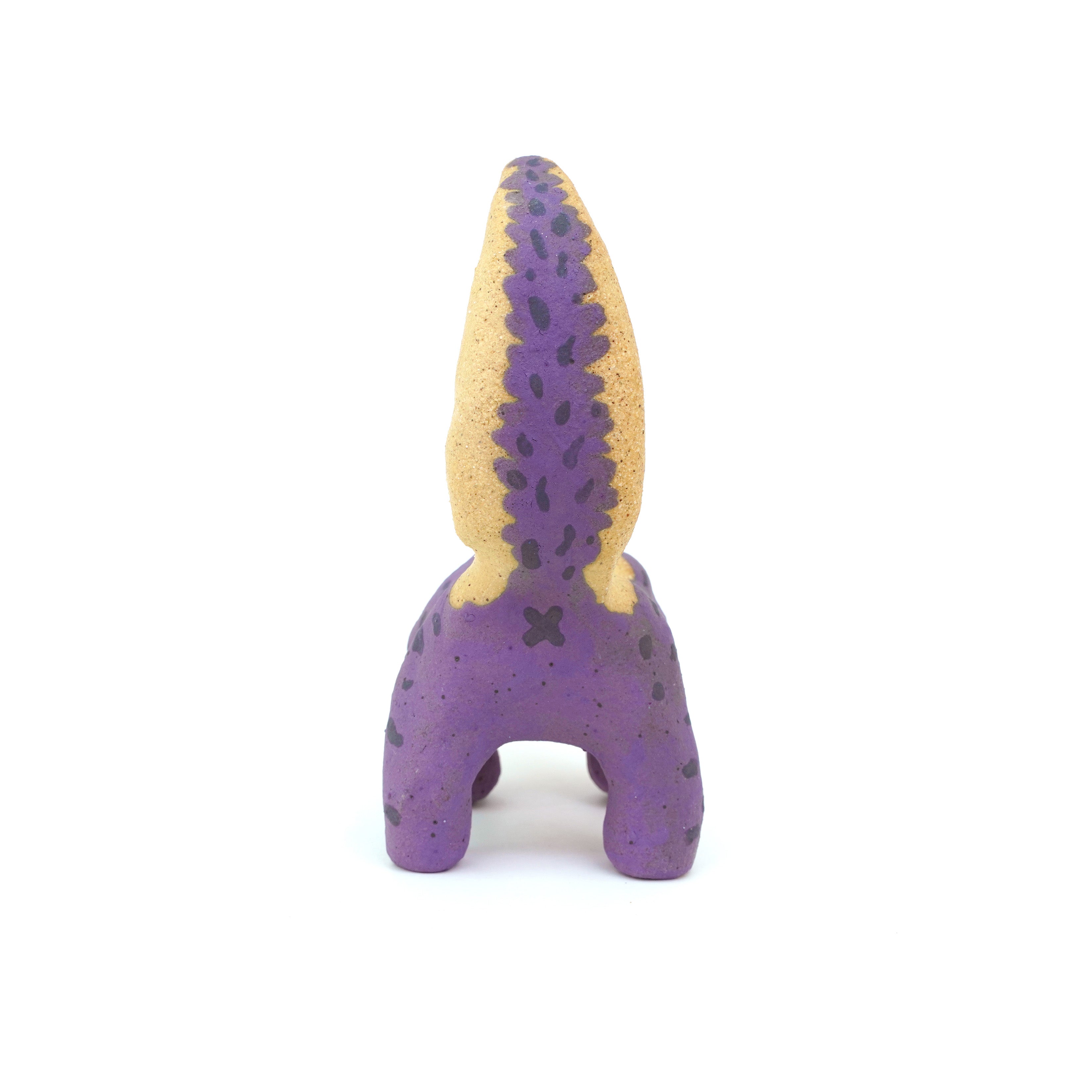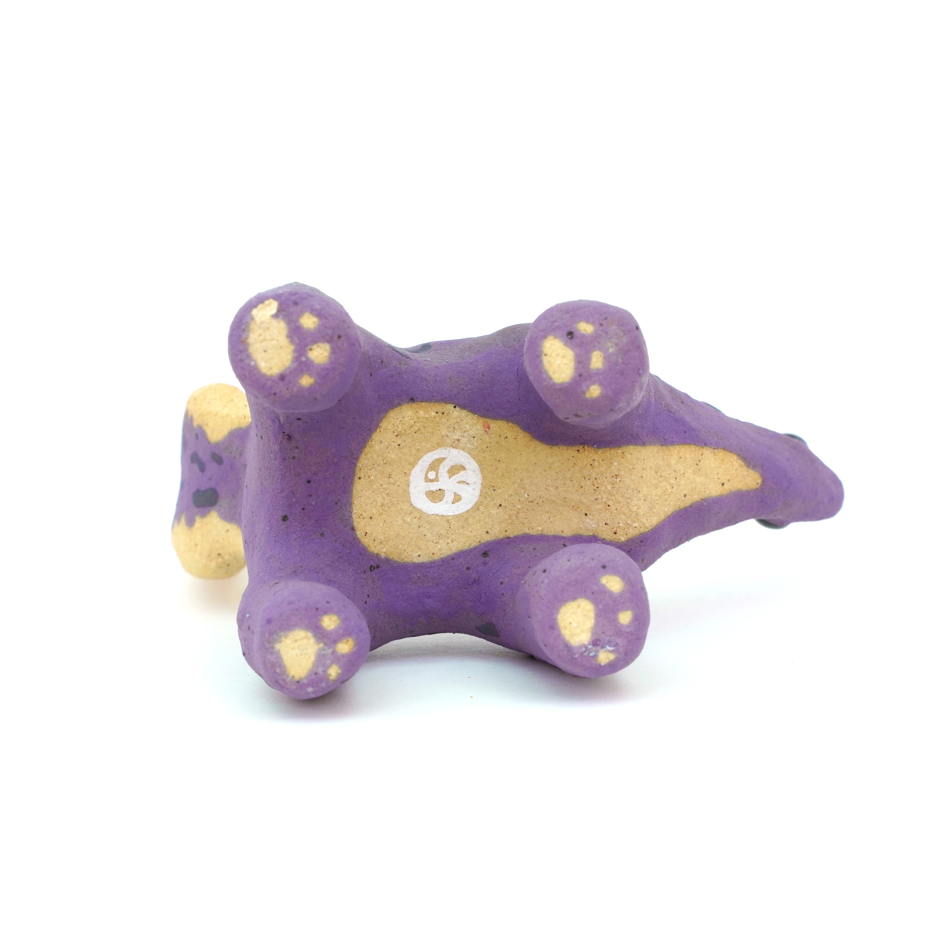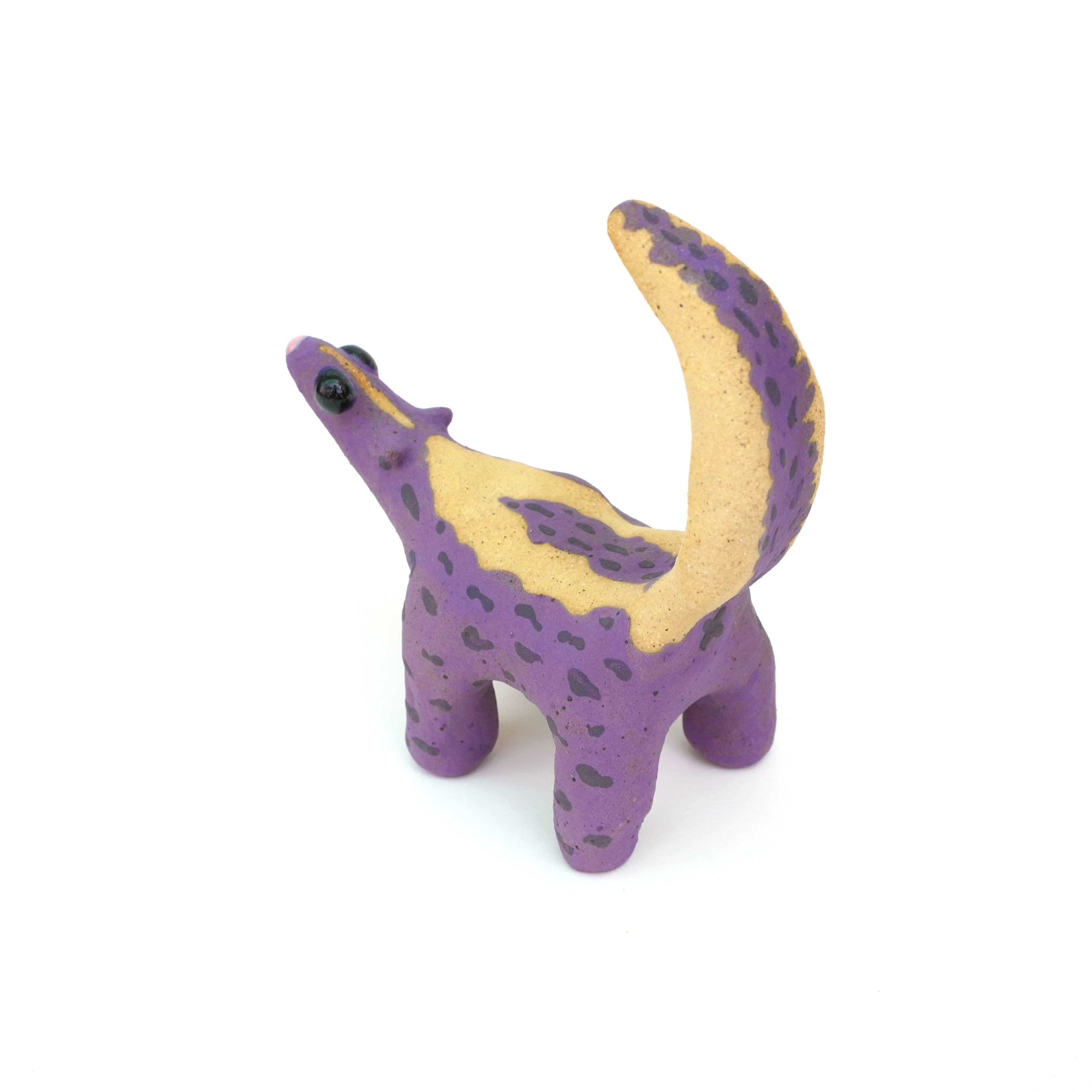 Ceramic sculpture of a purple skunk, done in a cartoon style with large bulbous black eyes and a very small, skinny head.