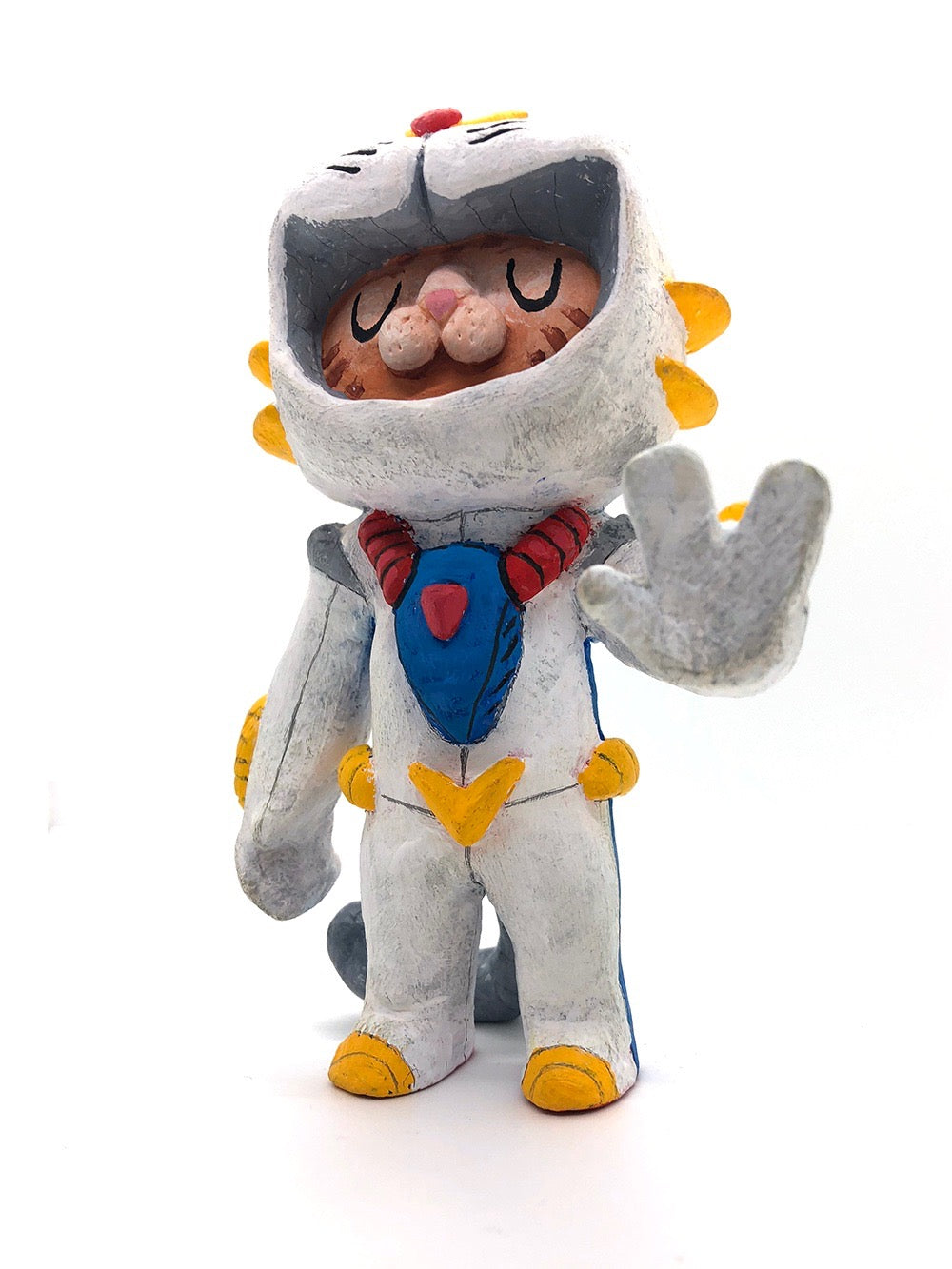 Sculpture of an orange cartoon tabby cat, dressed as a Evangelion style mech, in a white spacesuit with red, yellow and blue accessories. Its hand is extended out, fingers spread. Bottom is signed by the artist.