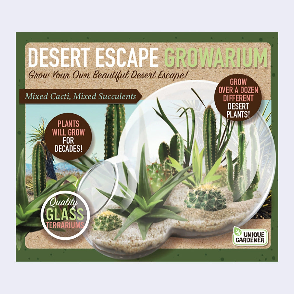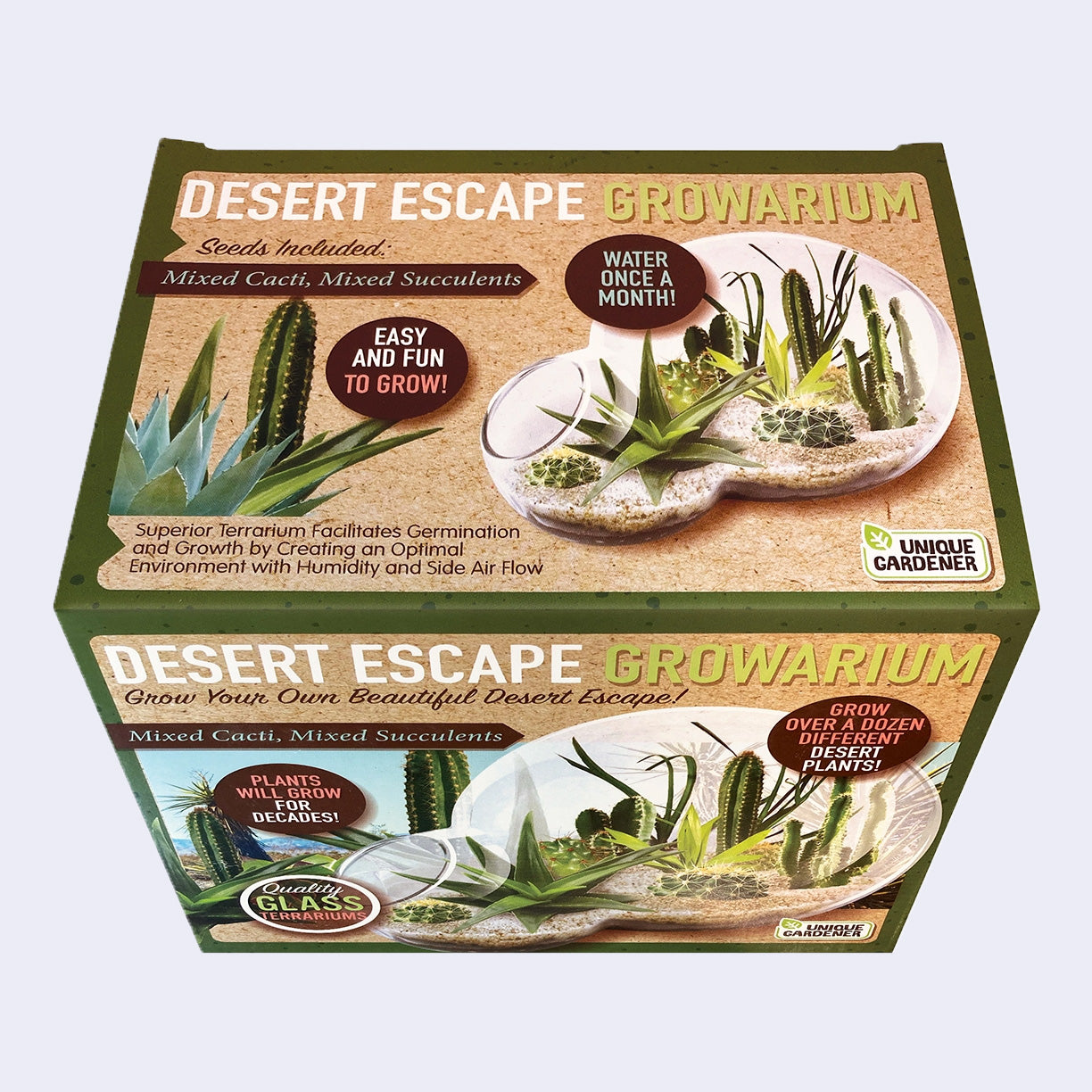 Grow kit including compressed soil disk, mixed cacti and mixed succulent seeds and glass terrarium.