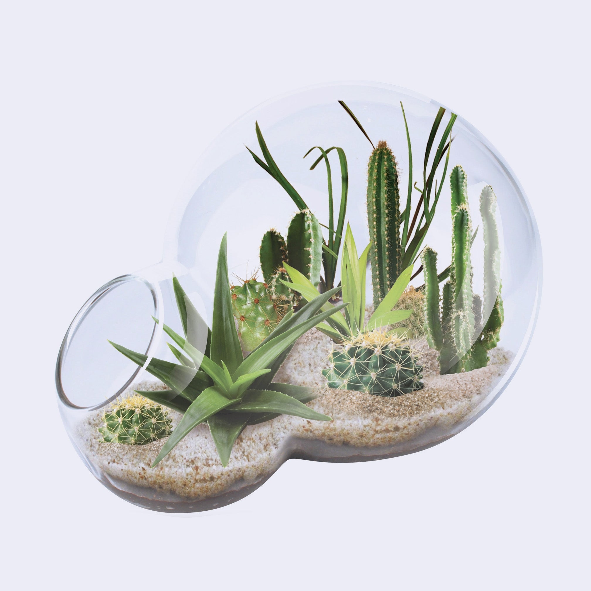 The unique double sphere glass terrarium was designed to give you the best growing experience possible. This custom high-quality glass terrarium was engineered to facilitate side air flow while still maintaining a humid growing area conducive to making plants thrive! Cacti and succulents are the perfect plant for terrariums and they will naturally limit their growth to match the size of the container they are growing in. They will flourish for years with minimal water. Everything you need is included- just add water! This elegant container with its miniature plants makes a beautiful addition to any space!