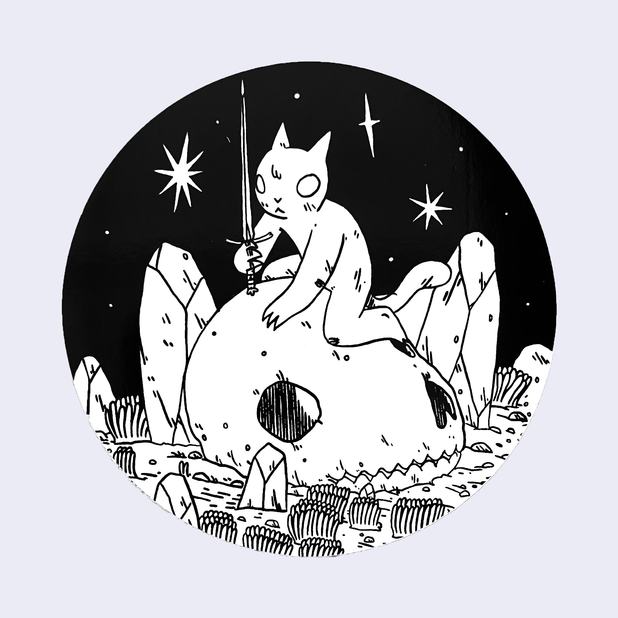 Night time cat conquering skull rock with a sword, a strangely soothing scene. Stick this wherever you like. A classic from Deth P. Sun. 1 sticker.