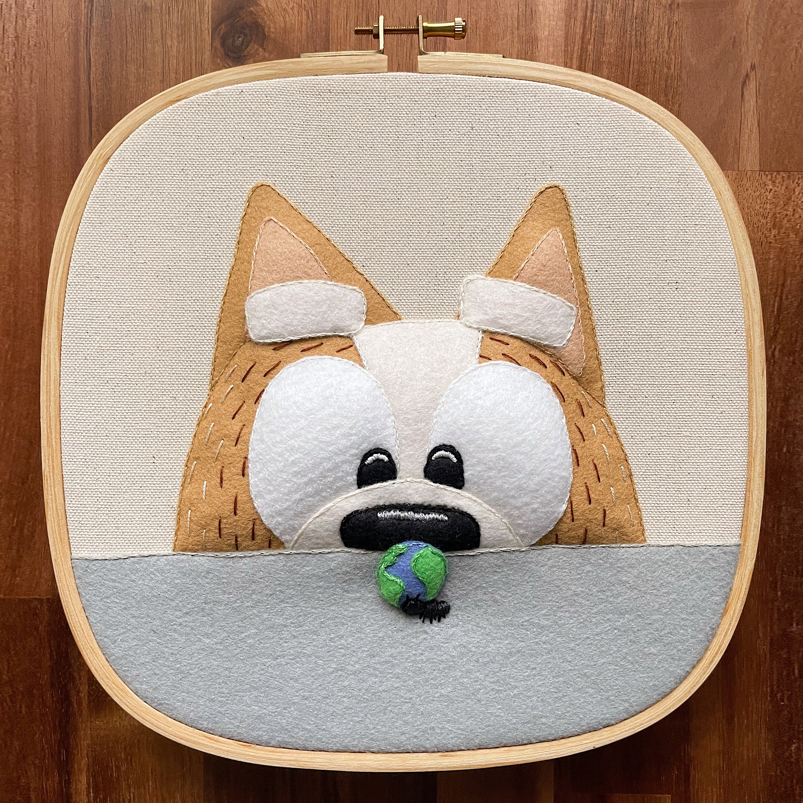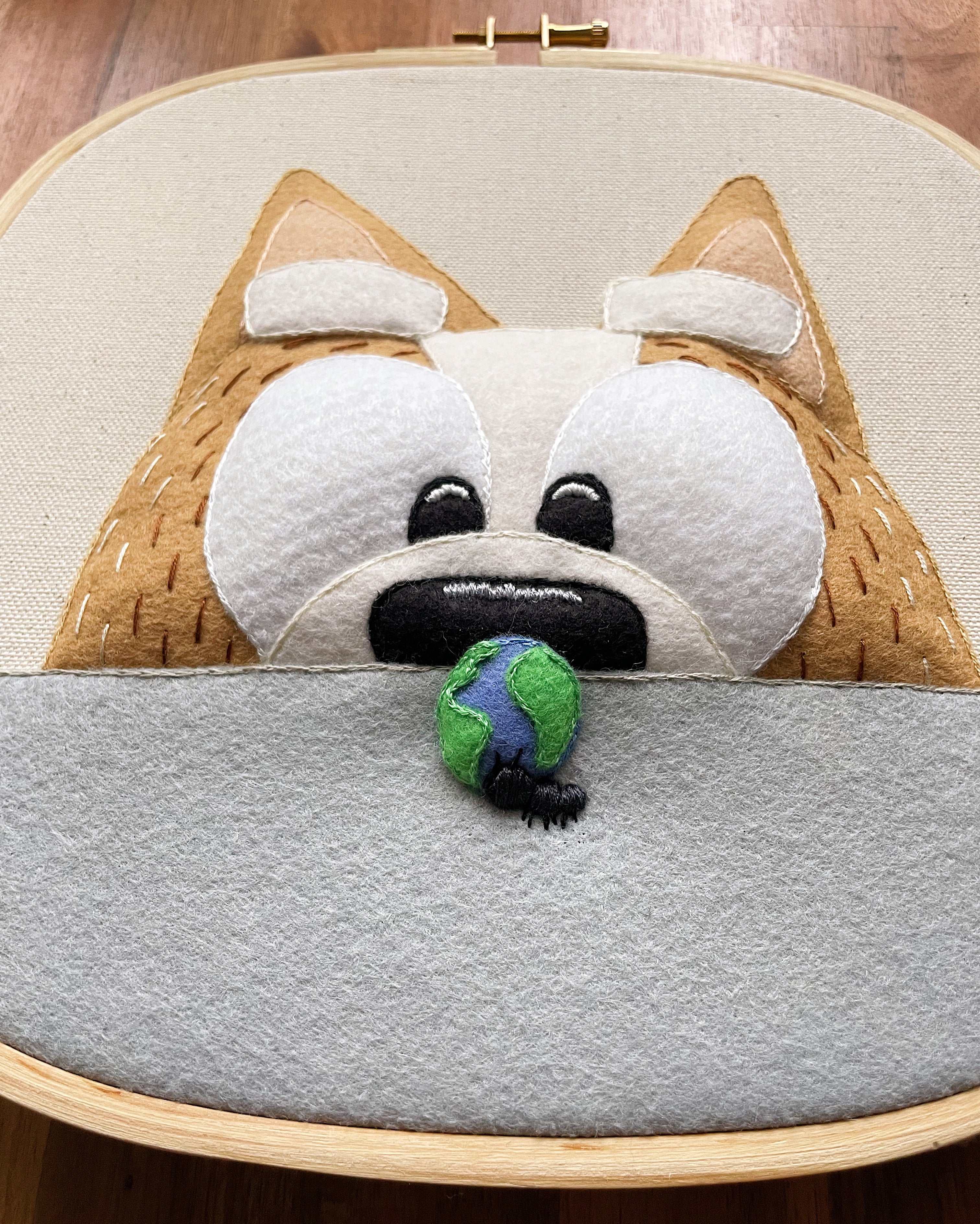 Embroidery floss, cotton fabric, and felt. Piece is framed in wooden embroidery hoop.