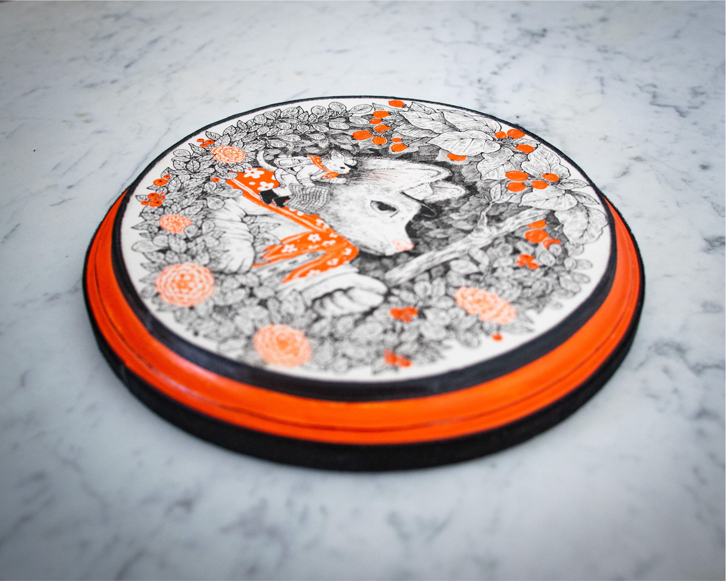 Pen and ink drawing on watercolor paper mounted on a wood plaque embellished with satin and velvet ribbons. The piece is backed with felt fabric and a sawtooth hook for display.