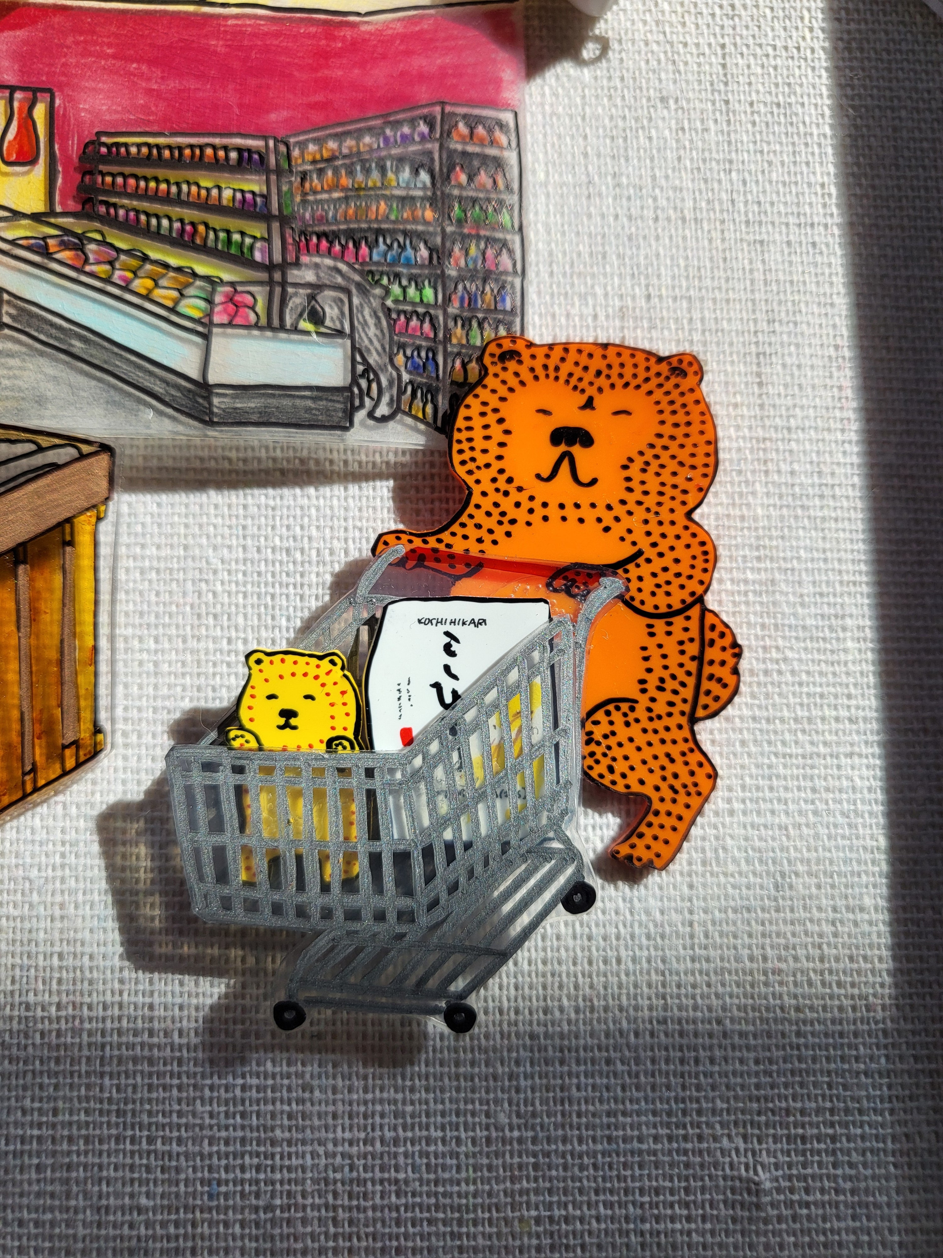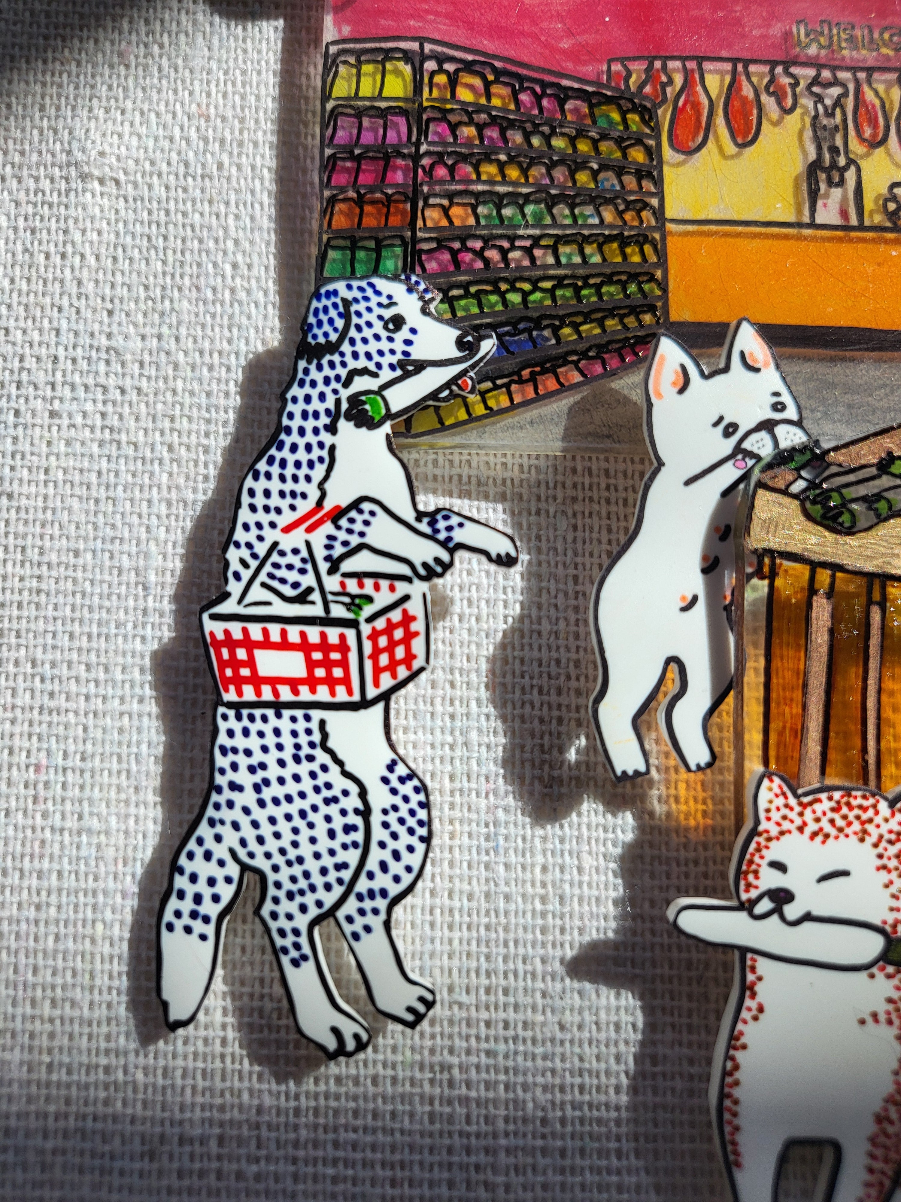 Shadowbox assembling of small sculptural pieces. Small dogs walk around a supermarket, pushing carts or holding baskets. Gold beads and strings decorate the piece.