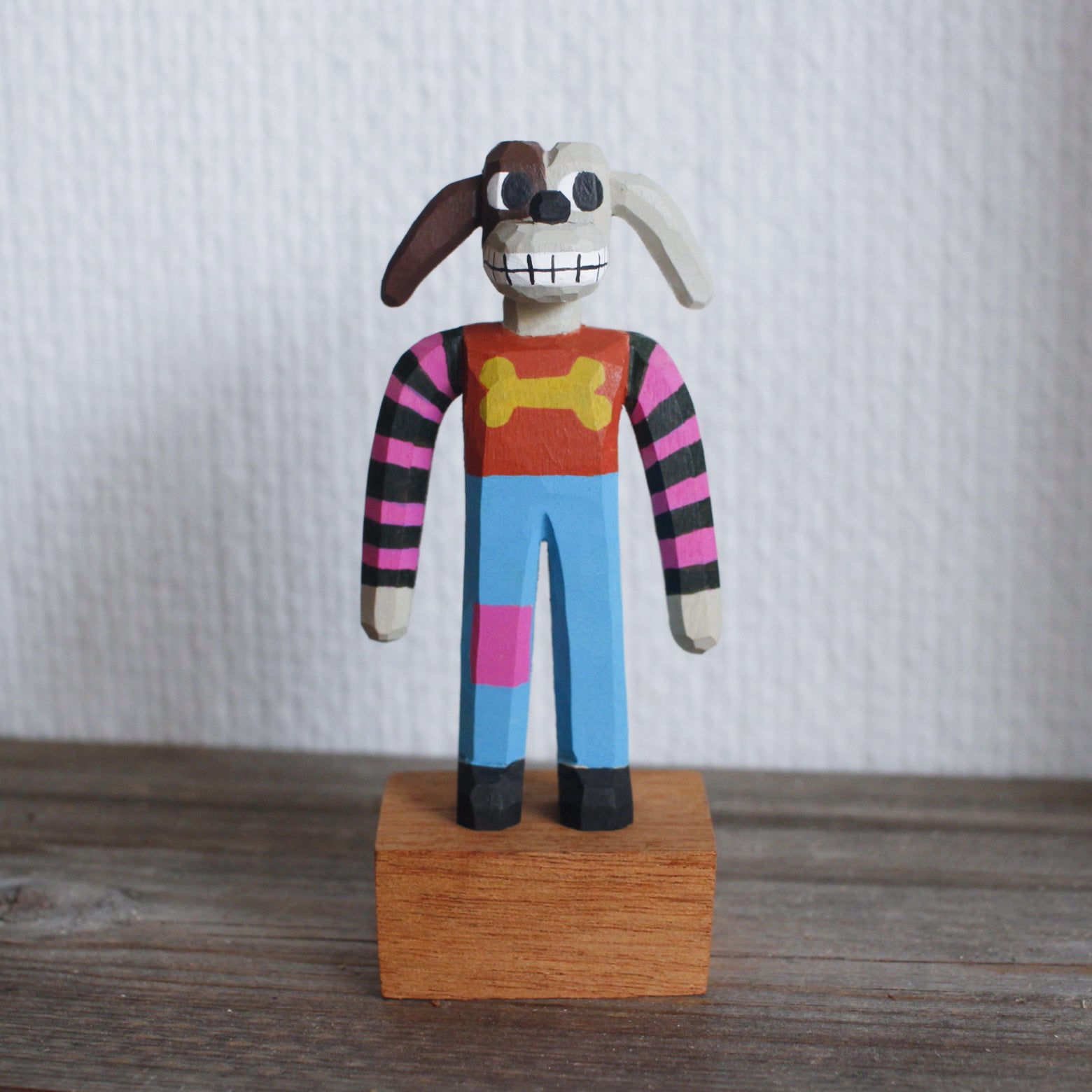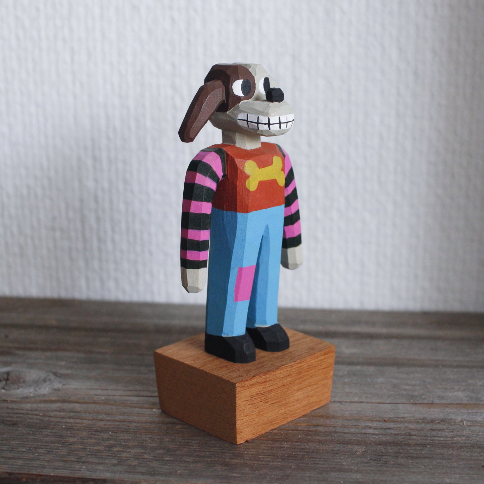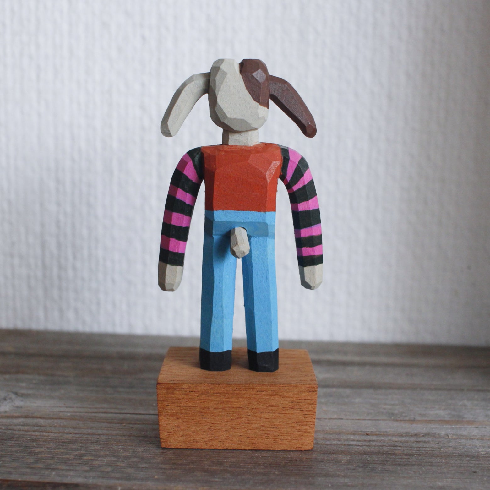Basswood, mahogany base, acrylic paint, natural beeswax finish.