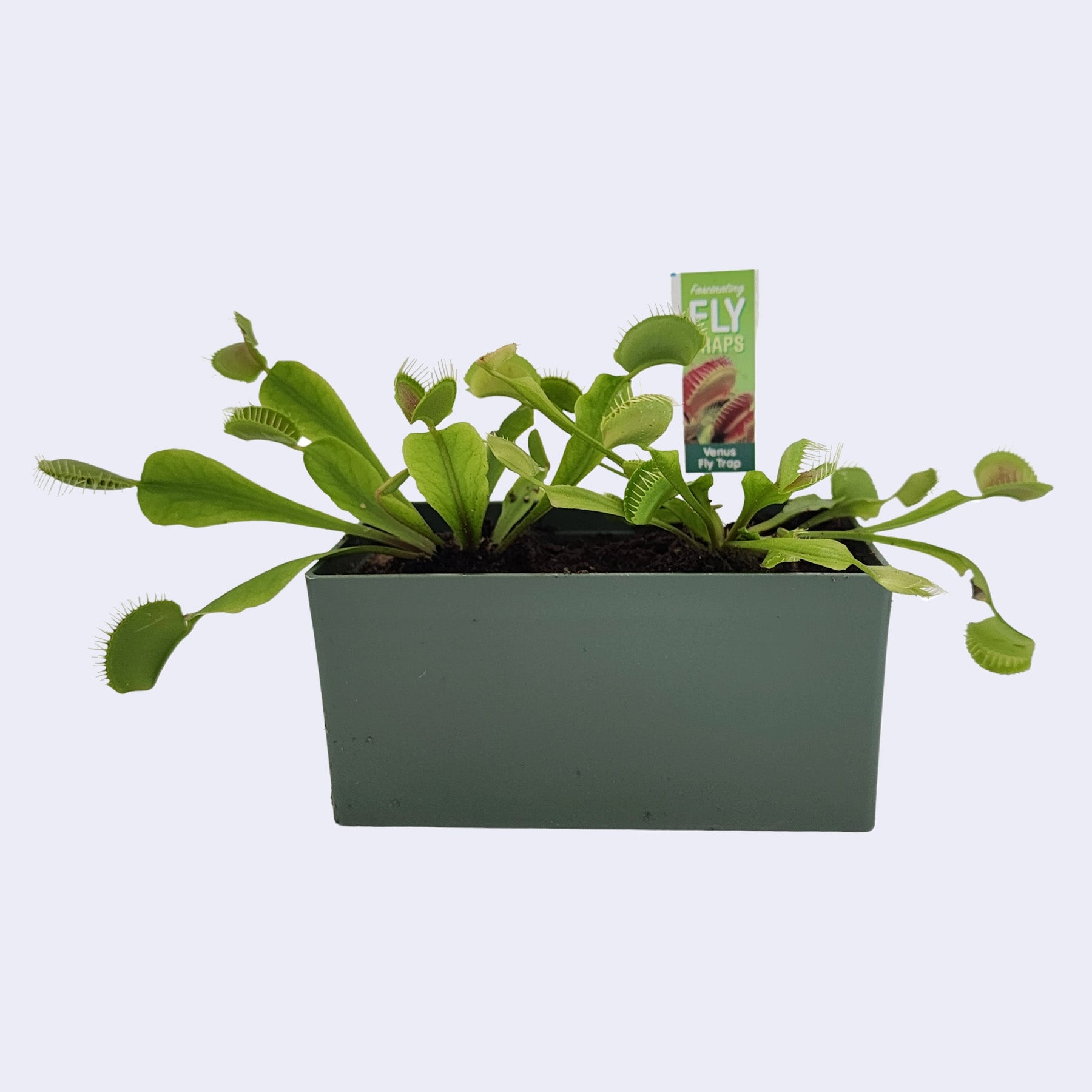 Several Venus Fly Trap plants growing in one rectangle shaped terrarium.