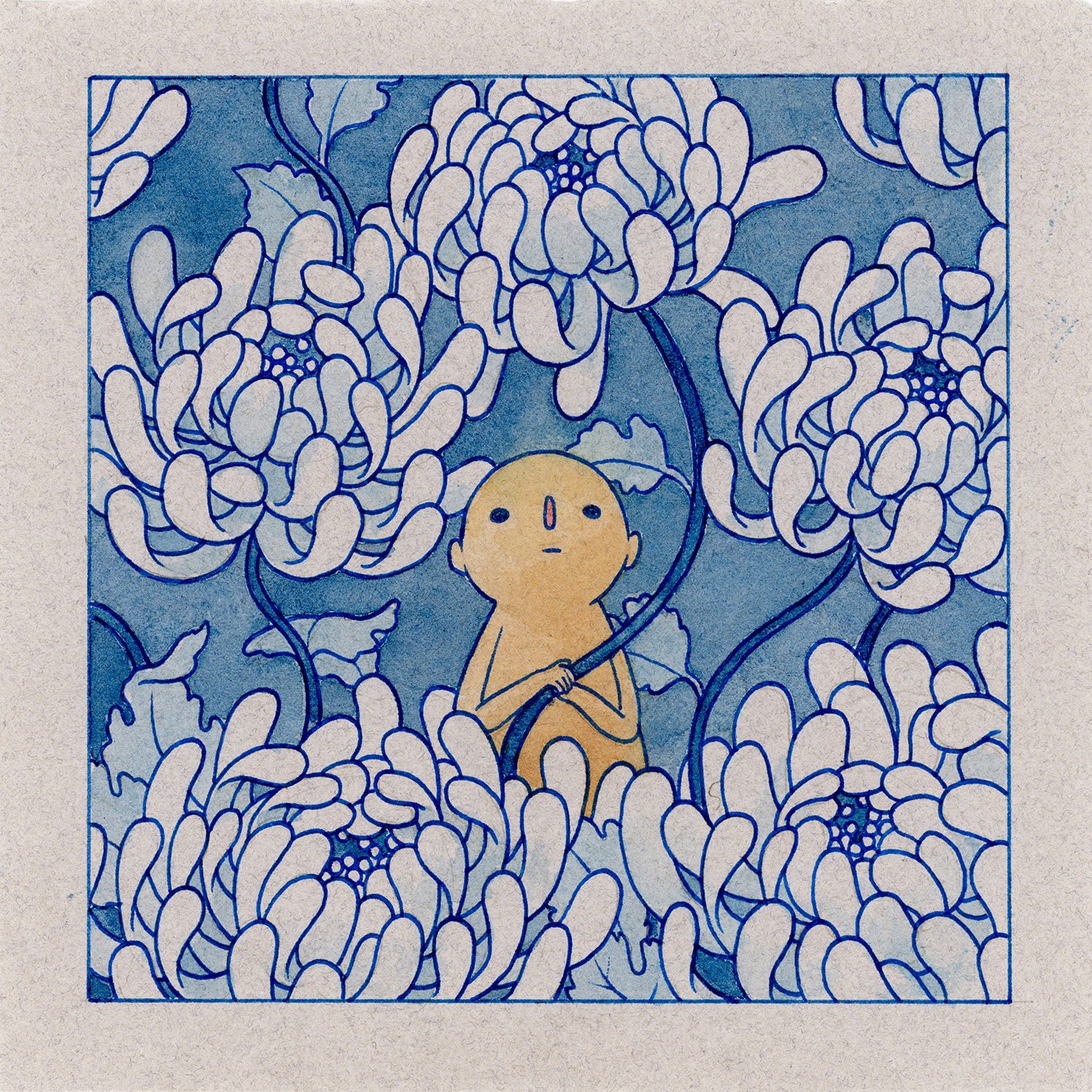 Blue monochrome illustration of a simplistic round headed character standing between many blossoming chrysanthemum flowers, holding on to the curving stem of one.