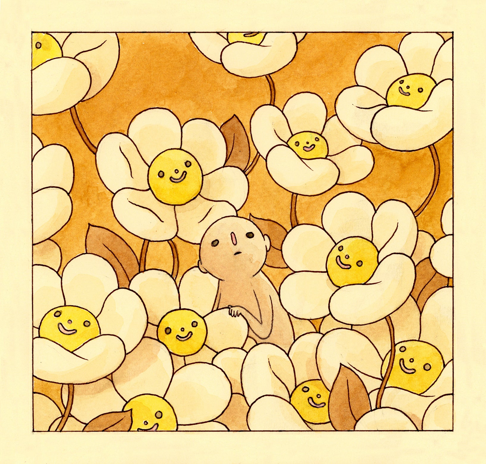 Yellow monochrome illustration of a simplistic round headed character standing between many large daisies with smiling faces. They have long wavy stems and sparse leaves.