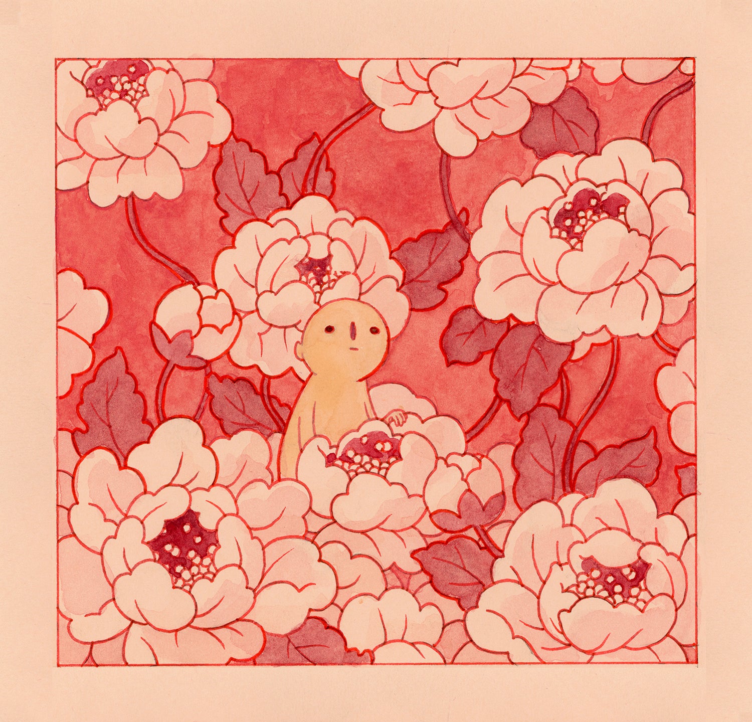 Red monochrome illustration of a simplistic round headed character standing between many large camellia flowers, with curled stems and many leaves..