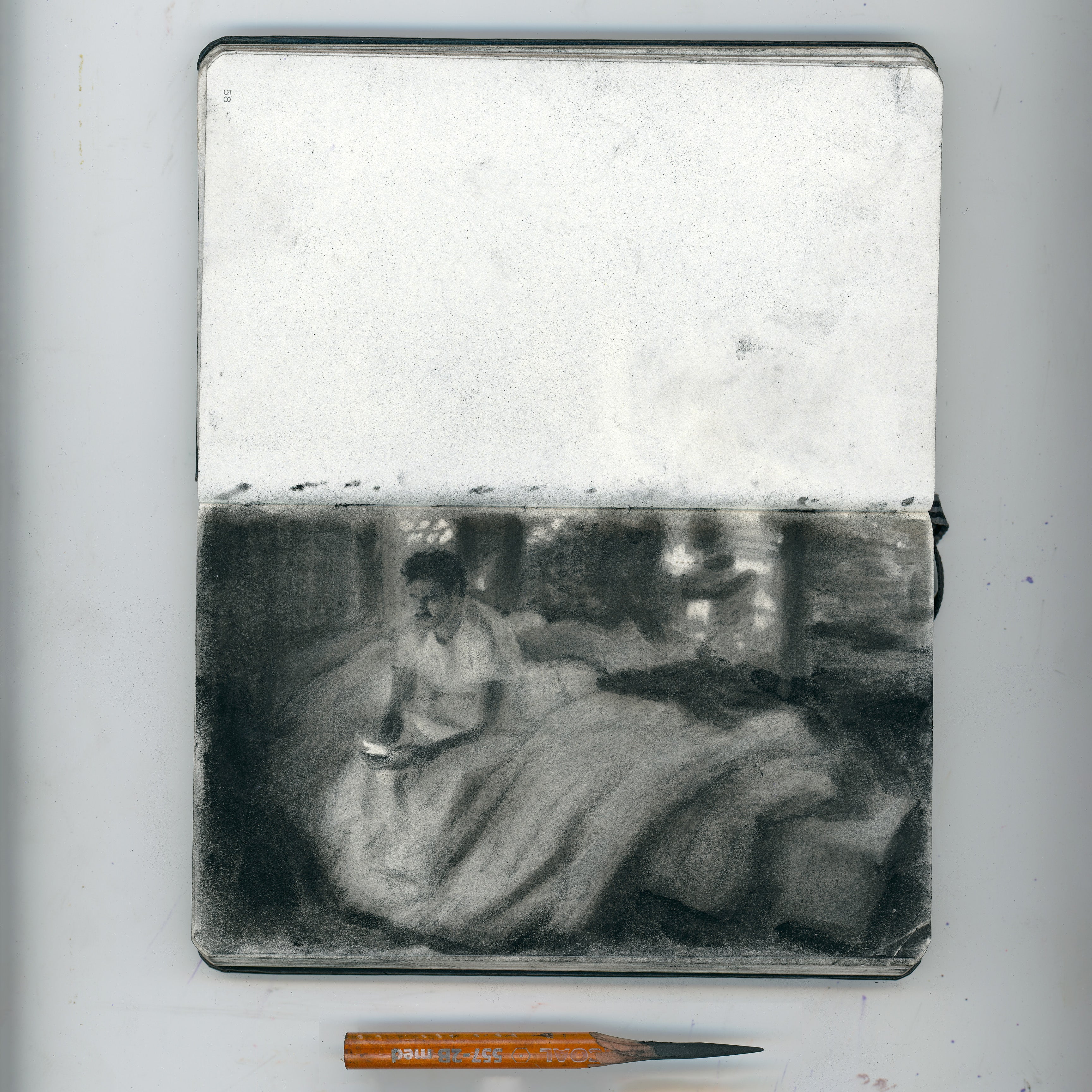 Charcoal on paper. Piece is the single sketchbook page, removed.