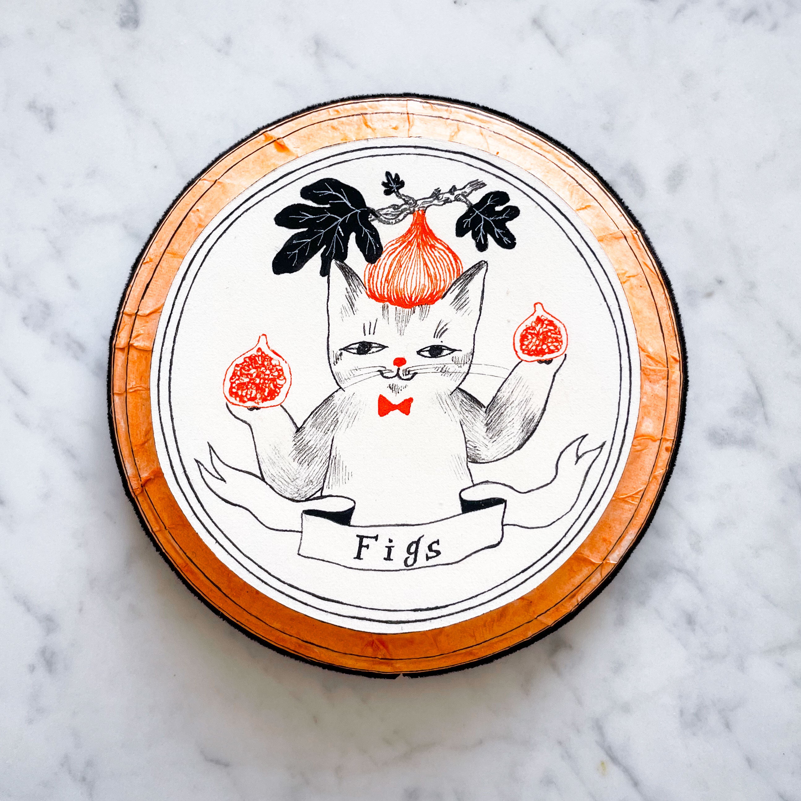 Pen and ink on wooden plaque, wrapped with velvet ribbon.