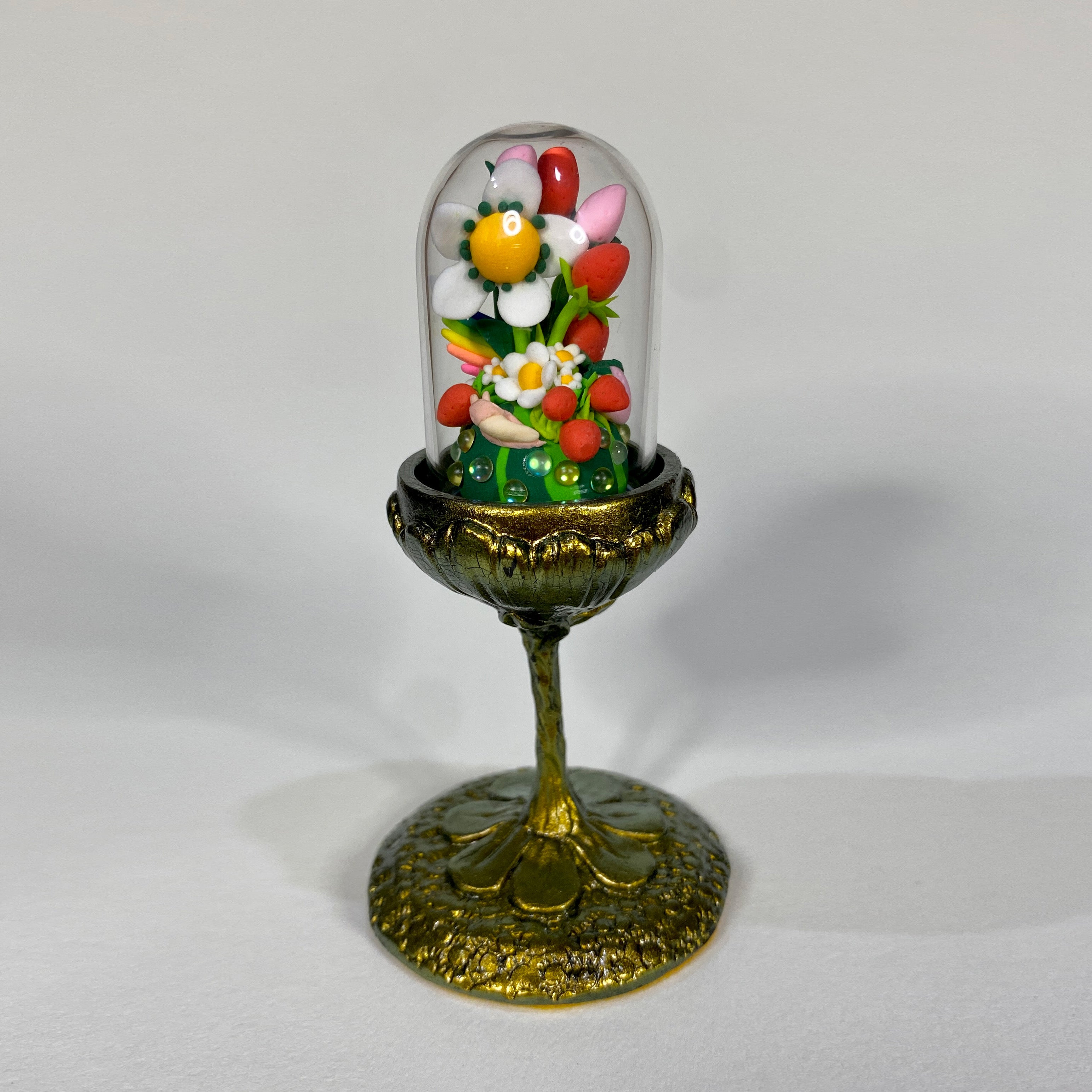 EVA foam clay, polymer clay, metallic pigment, foam, glass cloche, acrylic paint, felt, acrylic inclusions.