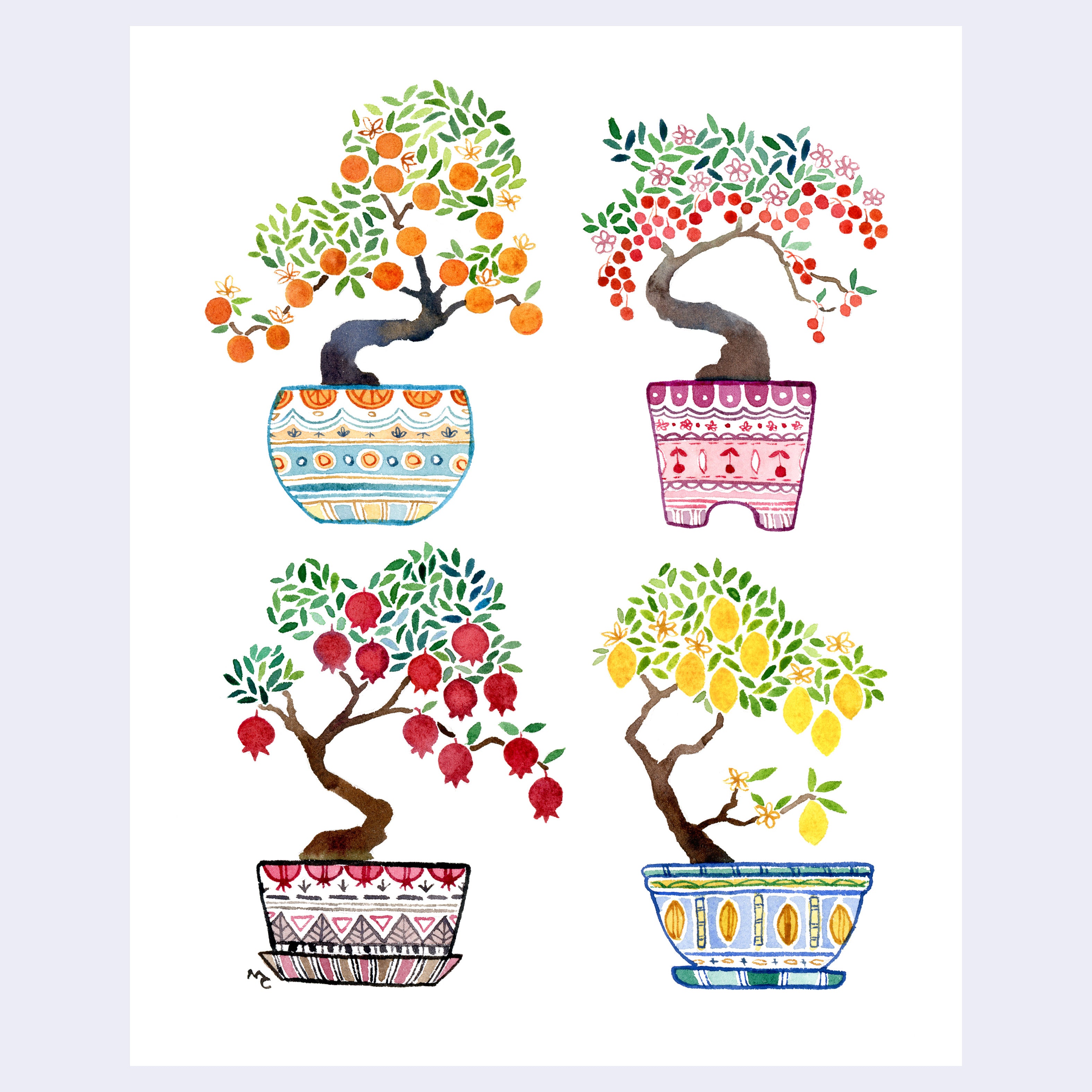 Watercolor illustration of colorful bonsai trees, all in colorful patterned pots and sprouting fruit.