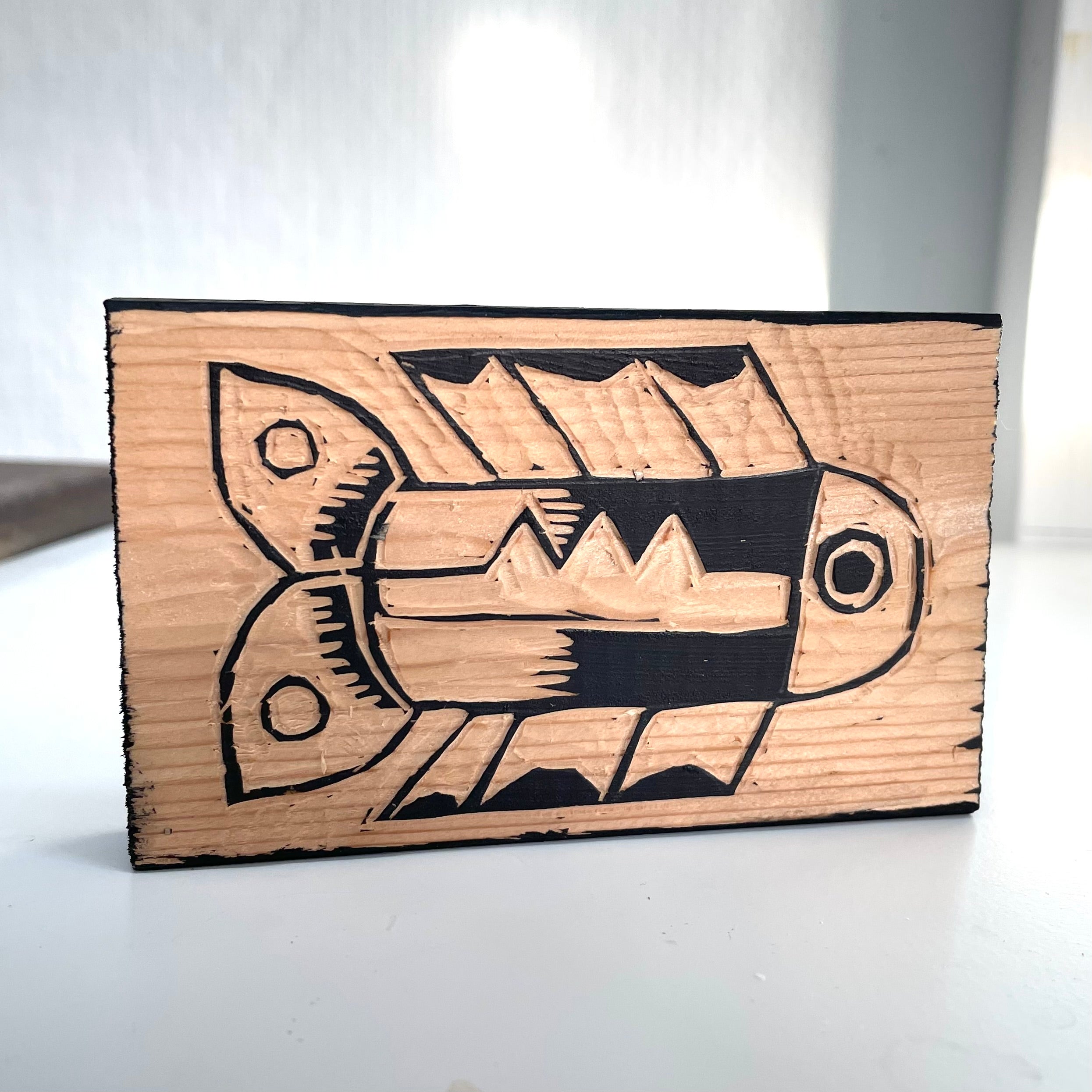 Standing woodcut.