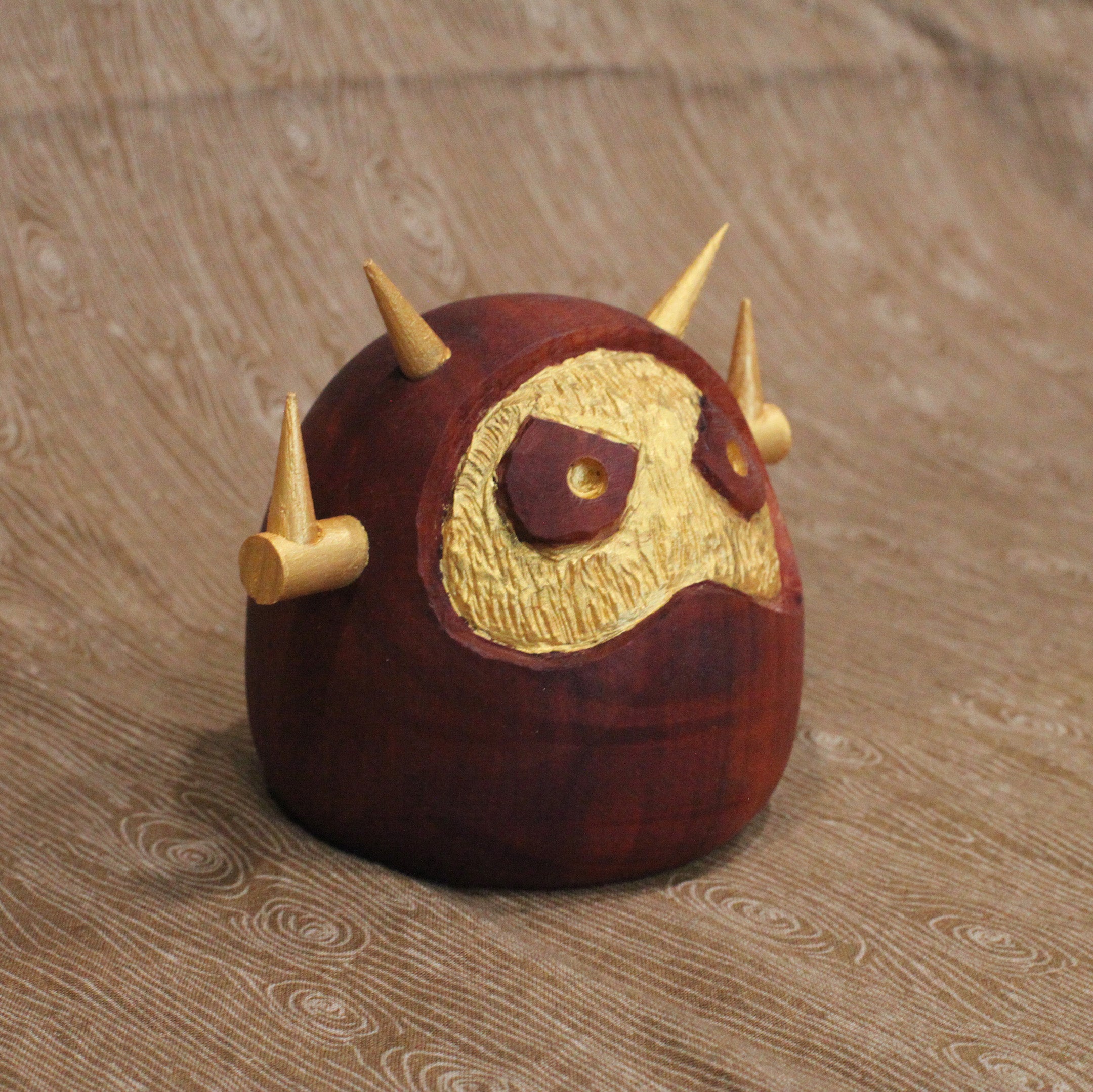 Wooden figure of a daruma figure with a golden face and head shaped like a Big Boss Robot.
