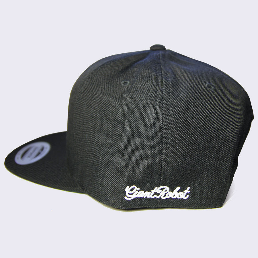 Big Boss Robot's classic angry stare is now found on these slick snap closure hats. All black hat with white robot and white embroidering. "Giant Robot" stitched on left side of these caps. Giant Robot hats always get you noticed.