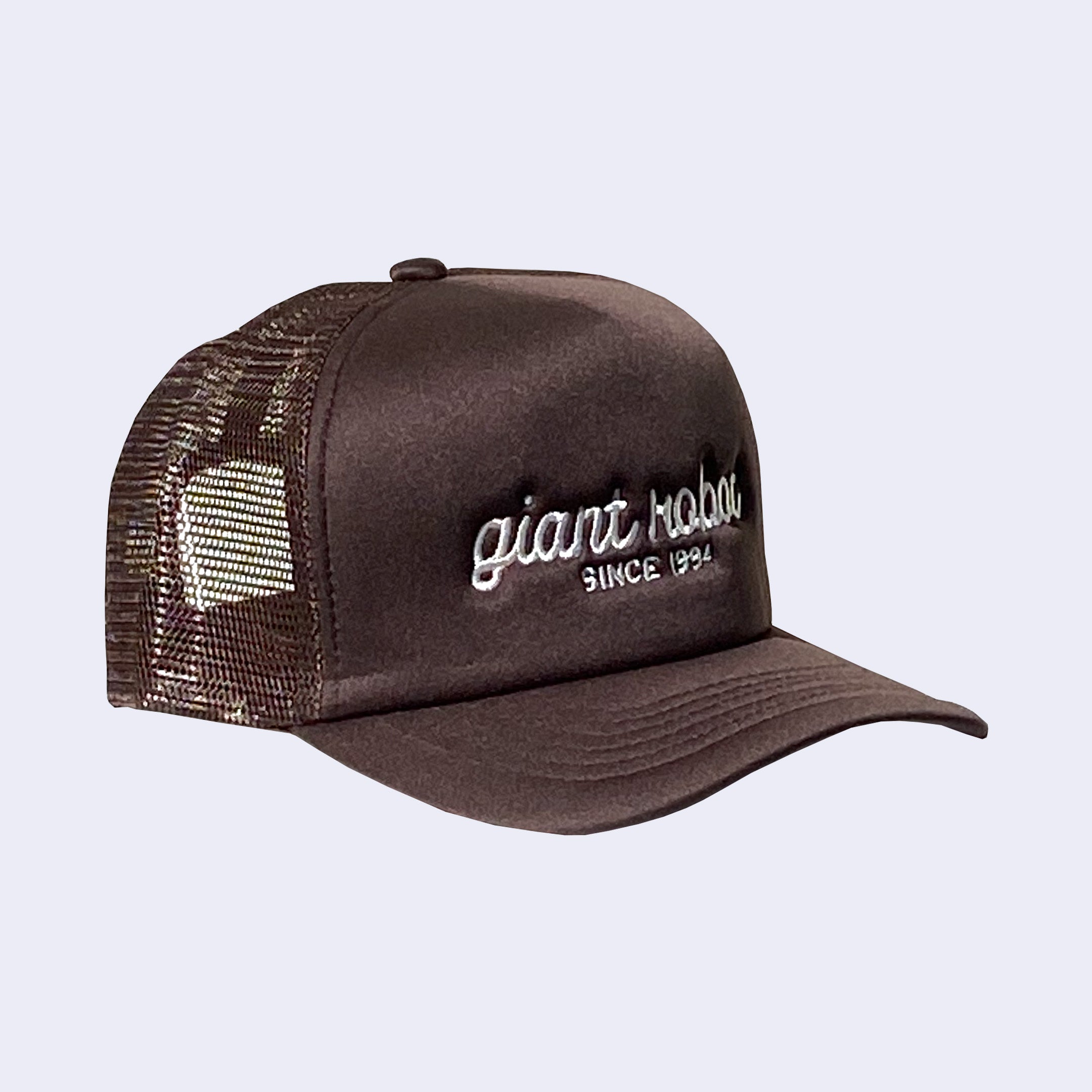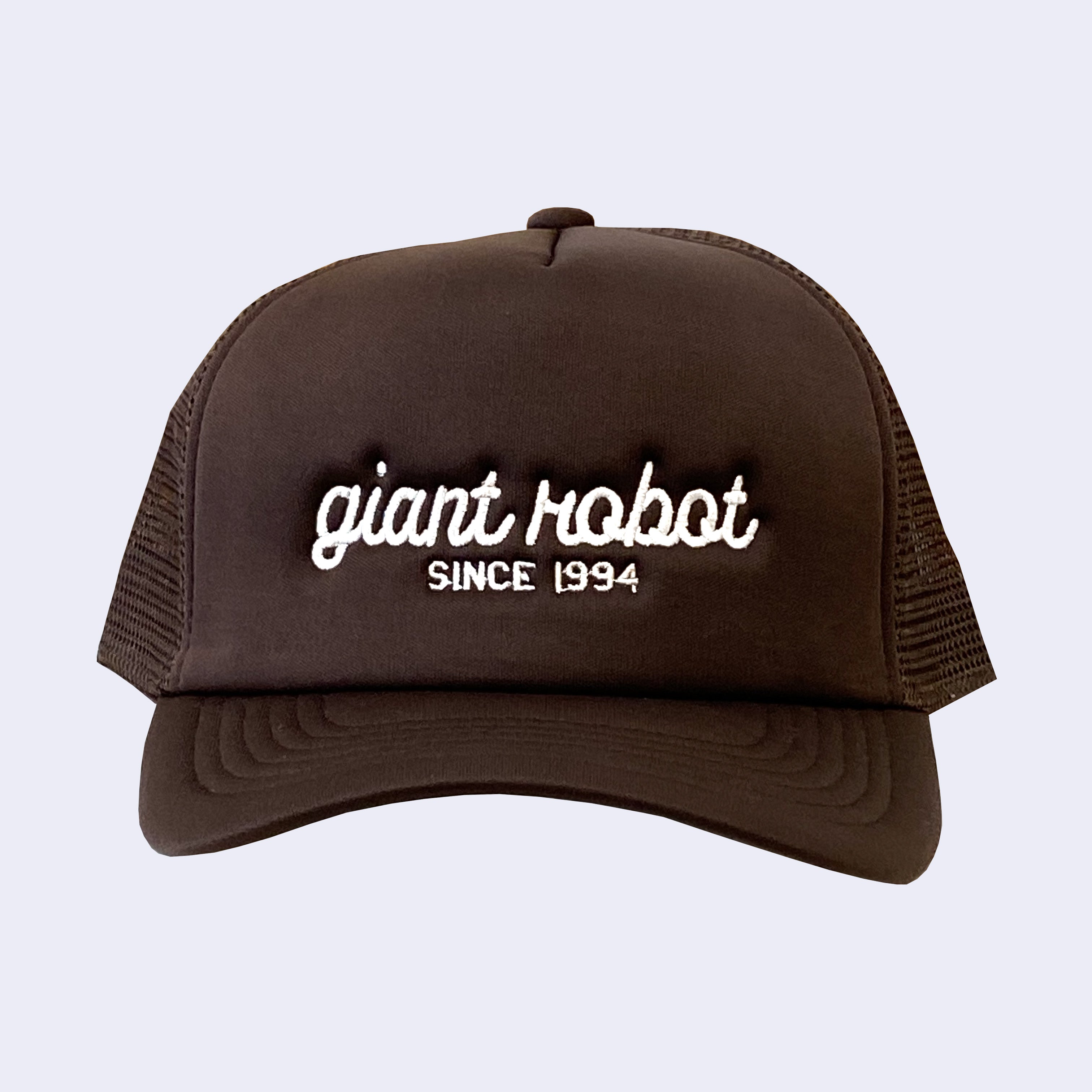 New Giant Robot lightweight mesh hat with our cursive logo in a nice accent color. Since 1994! Adjustable snap back for your noggin size.