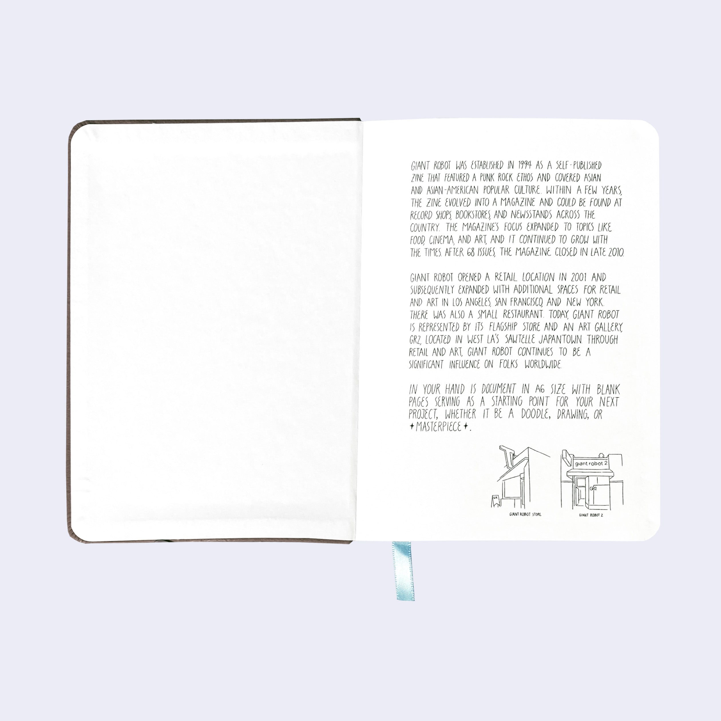 Made by Giant Robot for all our friends who have something to jot down, this hardcover journal contains 160 pages of cream colored blank paper. Perfect for sketching, journaling, keeping notes and thoughts. Our flag carrying Big Boss Robot decorates the front of this smooth pleather cover, creating a fun yet sleek look. With a light blue marker ribbon and an elastic closure, all of your pages will be kept in tact nicely.