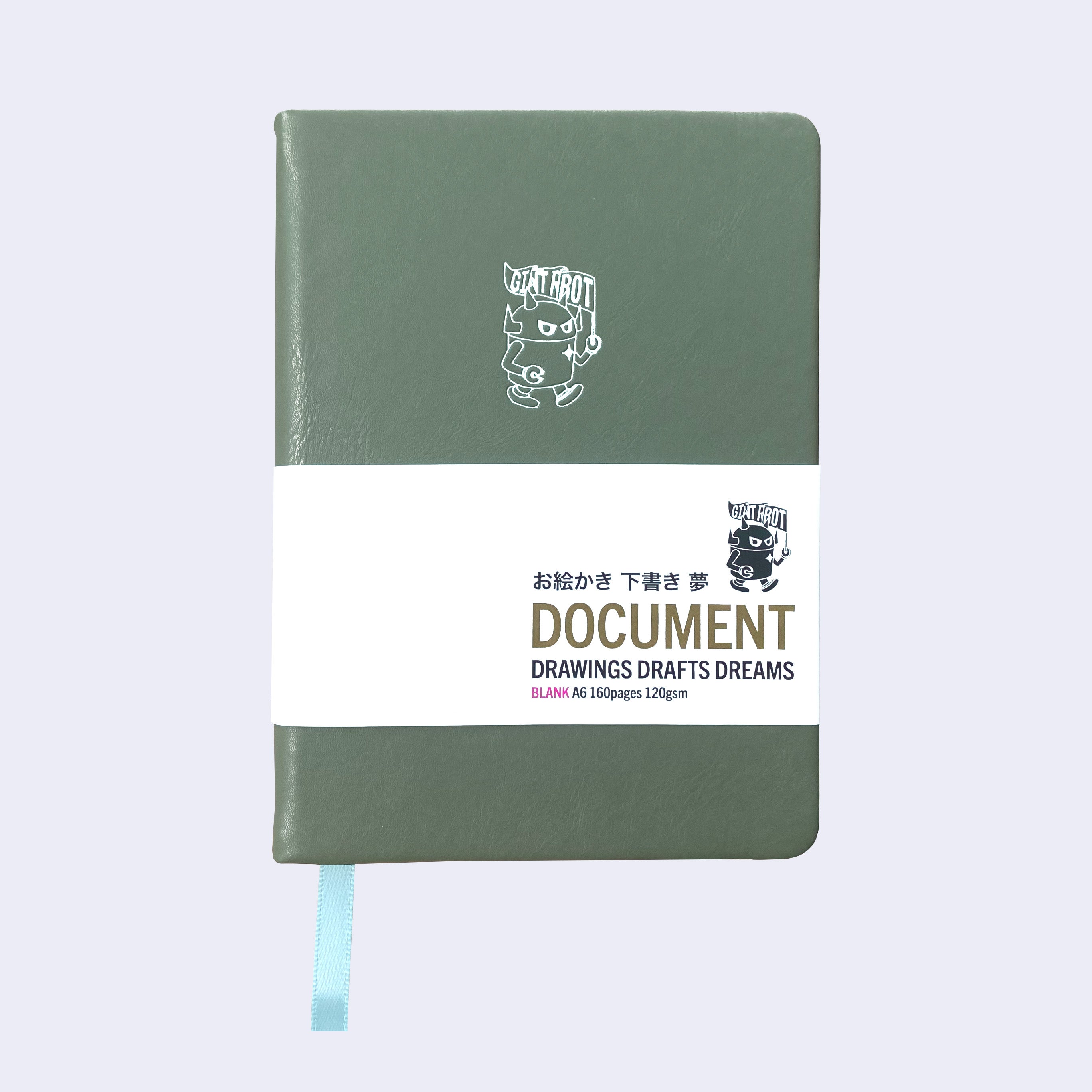Granite green colored pleather covered sketchbook with a small embossment of a robot carrying a flag that reads "Giant Robot" in the upper center. Paper sleeve reads "Document - Drawings Drafts Dreams"