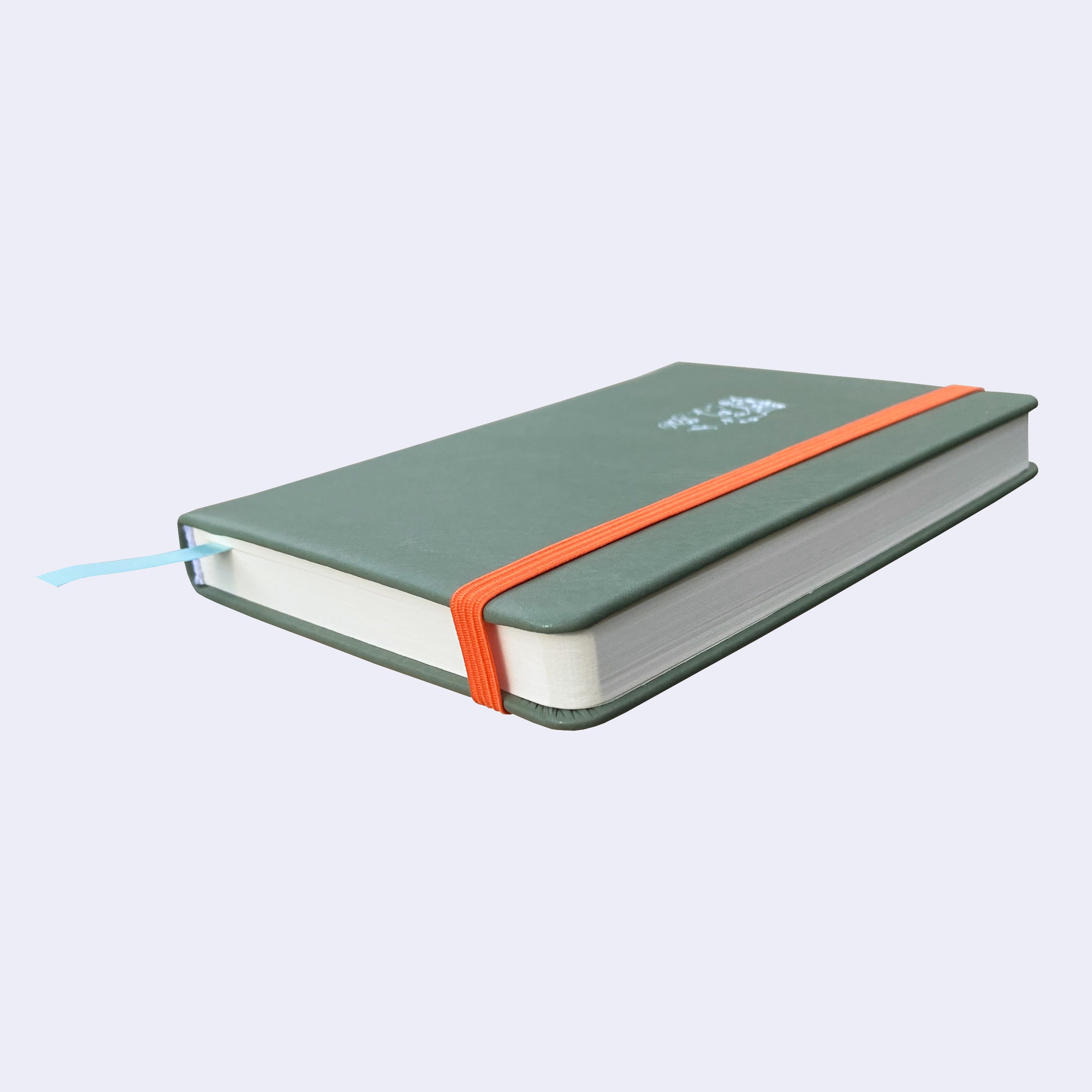 Granite green colored pleather covered sketchbook with a small embossment of a robot carrying a flag that reads "Giant Robot" in the upper center. A bright orange elastic band keeps the sketchbook closed. Side view.