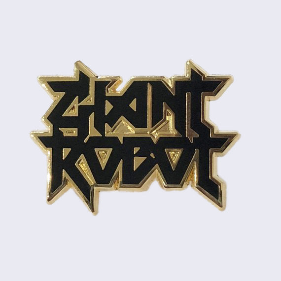 Black enamel pin with "Giant Robot" written in stylized heavy metal writing, with gold outline.